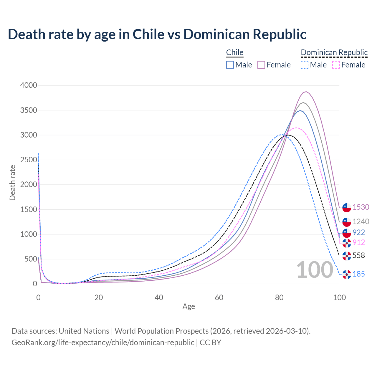 The average life expectancy at birth is 81.7 years in Chile vs 74.1 in the Dominican Republic. Chile is ranked 38/197 by life expectancy, and the Dominican Republic is 101/197. In Chile, the life expectancy is 79.9 years for males and 83.5 years for females. In the Dominican Republic, it's 70.9 years for males and 77.4 years for females.