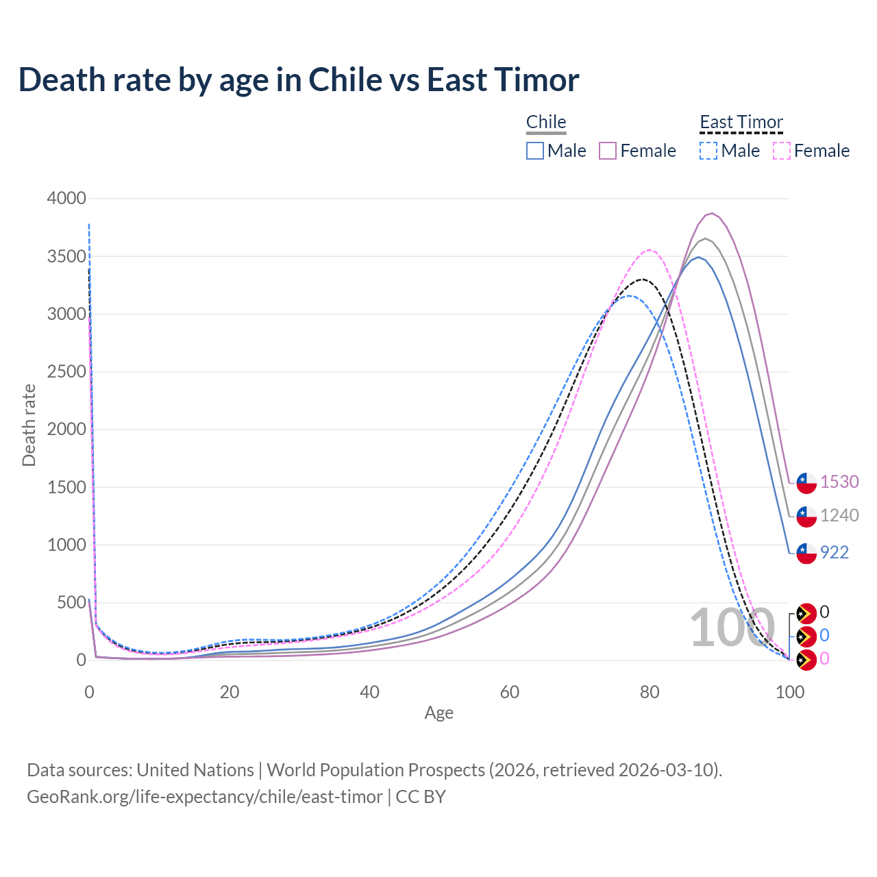 In Chile, the most common age of death is 88, compared to 0 in East Timor. The median age of death is 84.8 in Chile and 73.9 in East Timor, meaning only half of each cohort is expected to live past that age.