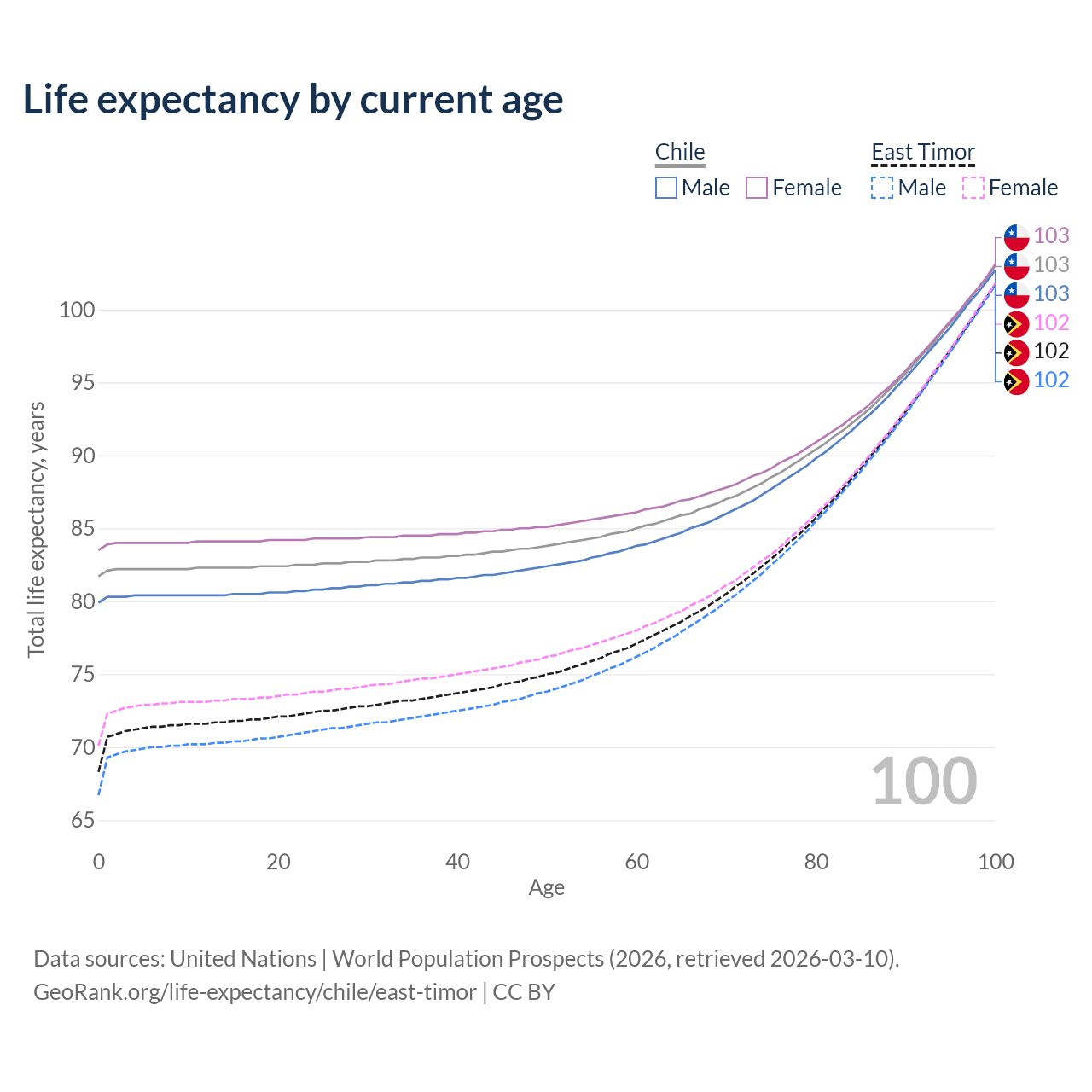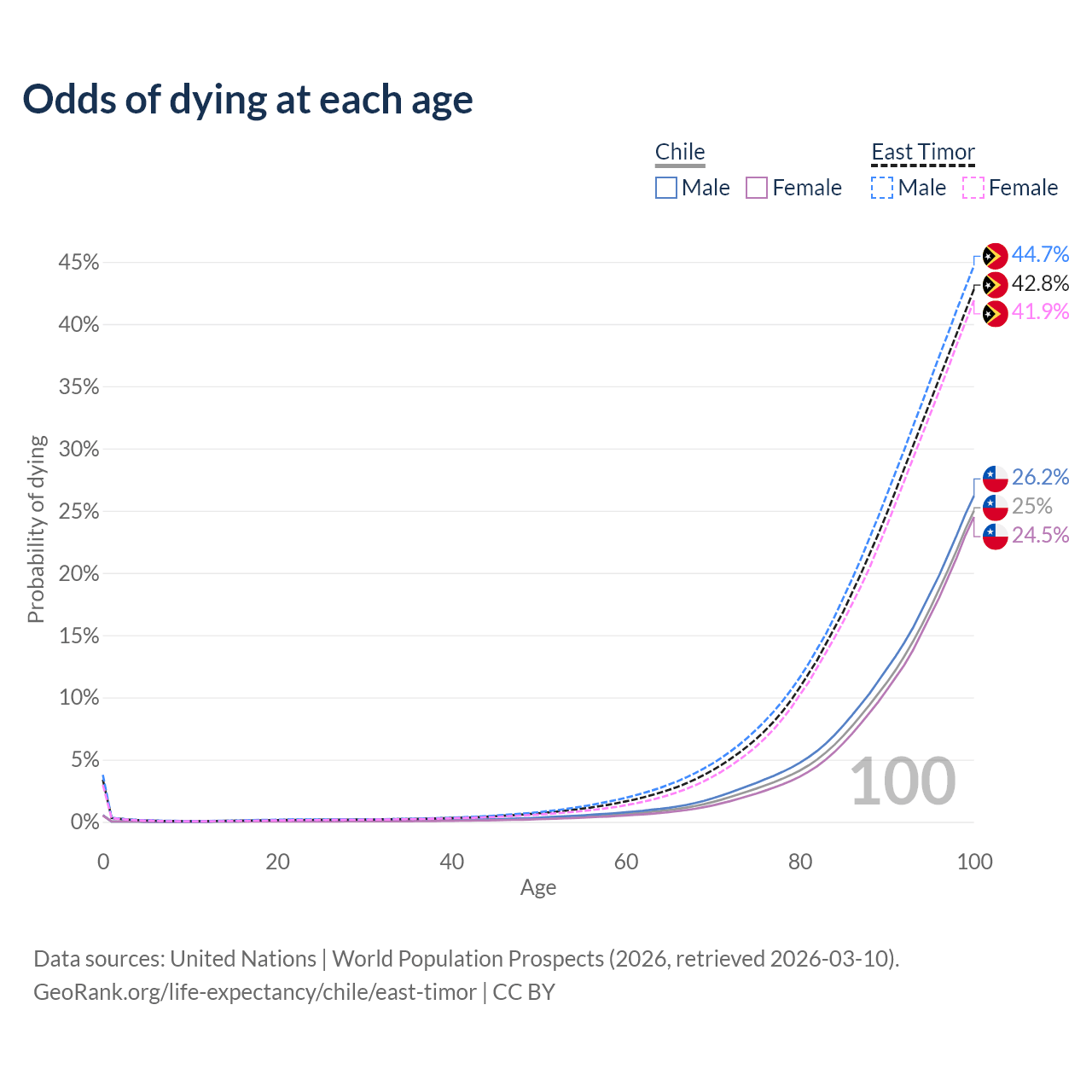 This life expectancy calculator shows the odds of living to 100, 95, 90, and below based on current age for both males and females in Chile and East Timor, along with mean and median age of death. The calculations are based on the 2026 life tables (actuarial tables) from the UN World Population Prospects.