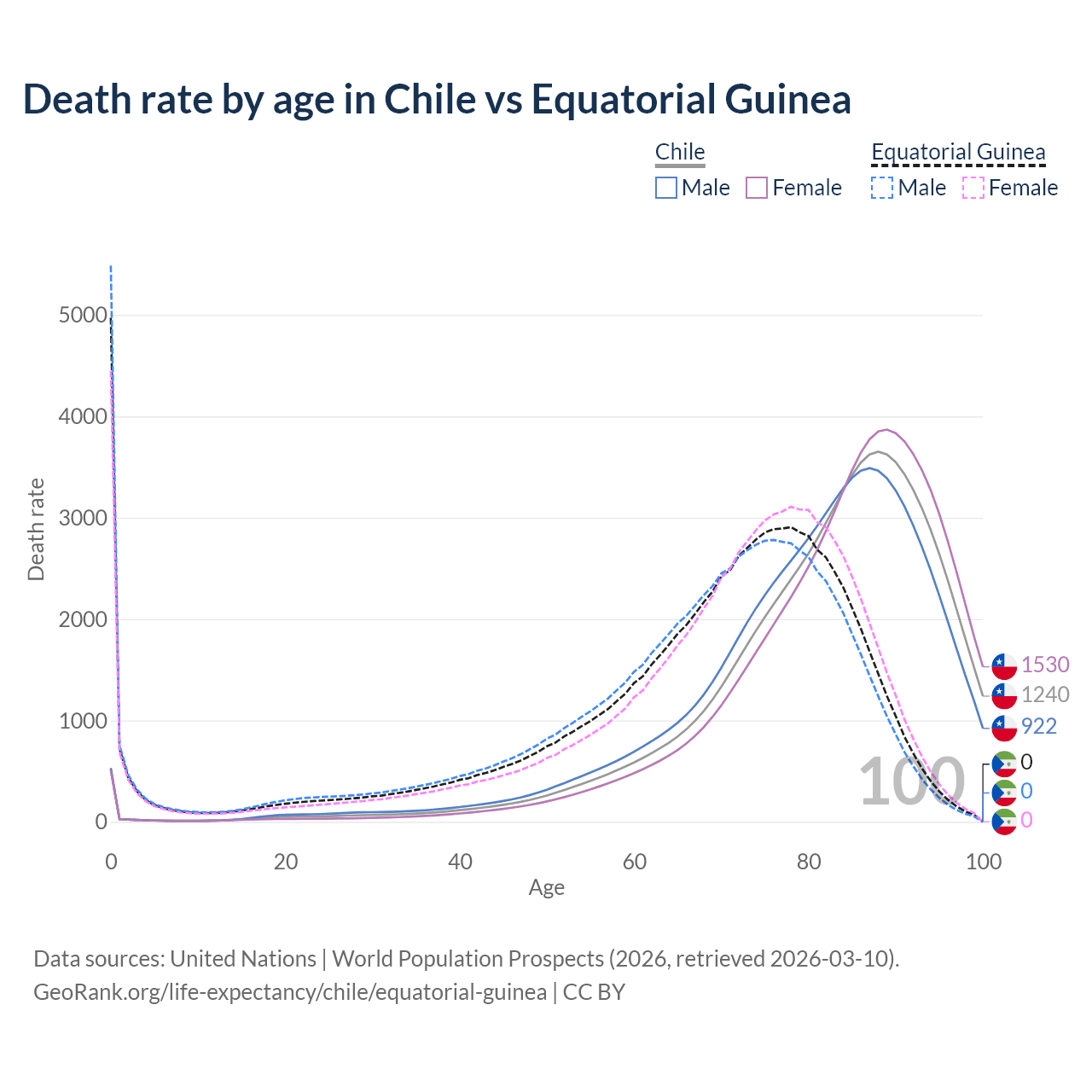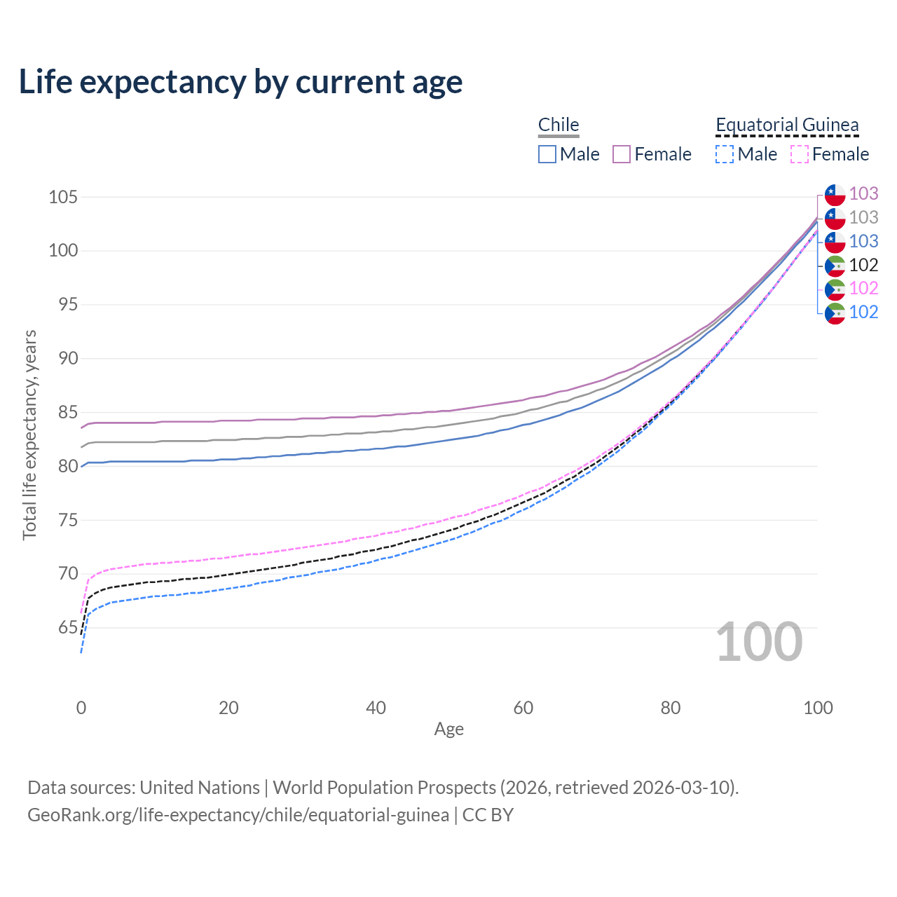 This life expectancy calculator shows the odds of living to 100, 95, 90, and below based on current age for both males and females in Chile and Equatorial Guinea, along with mean and median age of death. The calculations are based on the 2026 life tables (actuarial tables) from the UN World Population Prospects.