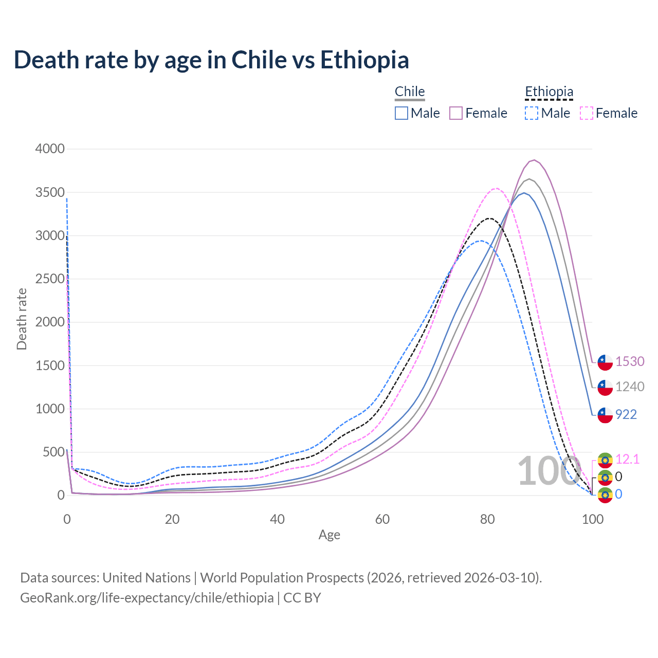 The average life expectancy at birth is 81.7 years in Chile vs 68.1 in Ethiopia. Chile is ranked 38/197 by life expectancy, and Ethiopia is 150/197. In Chile, the life expectancy is 79.9 years for males and 83.5 years for females. In Ethiopia, it's 64.9 years for males and 71.6 years for females.