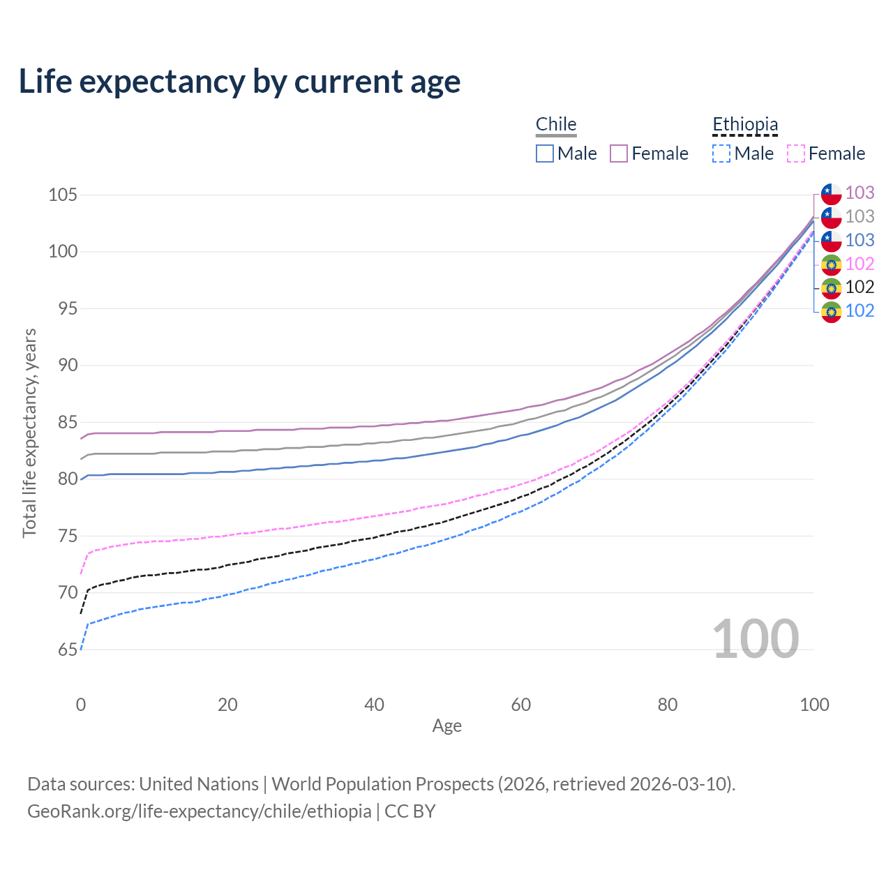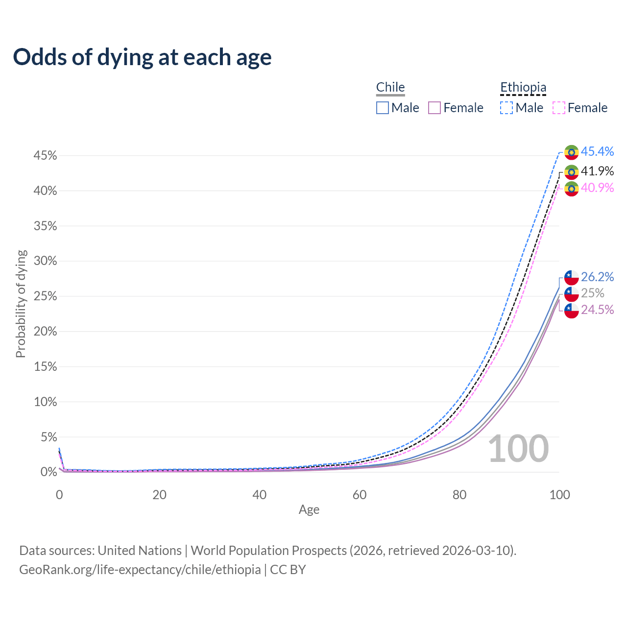 This life expectancy calculator shows the odds of living to 100, 95, 90, and below based on current age for both males and females in Chile and Ethiopia, along with mean and median age of death. The calculations are based on the 2026 life tables (actuarial tables) from the UN World Population Prospects.