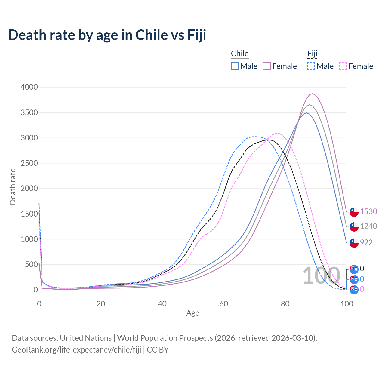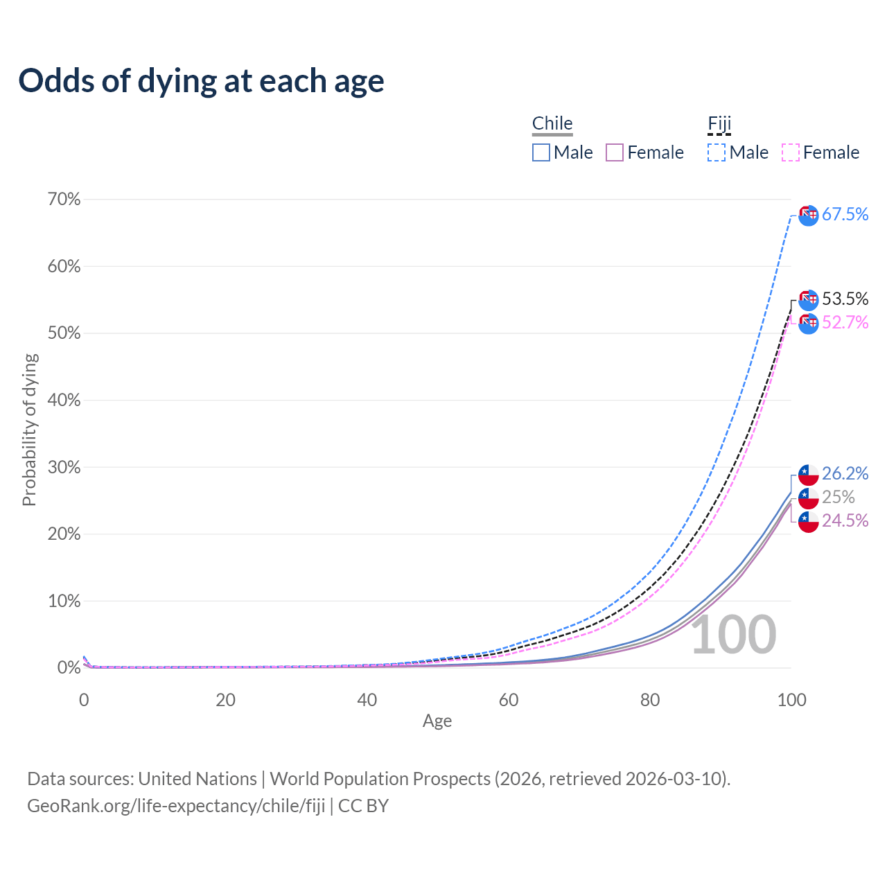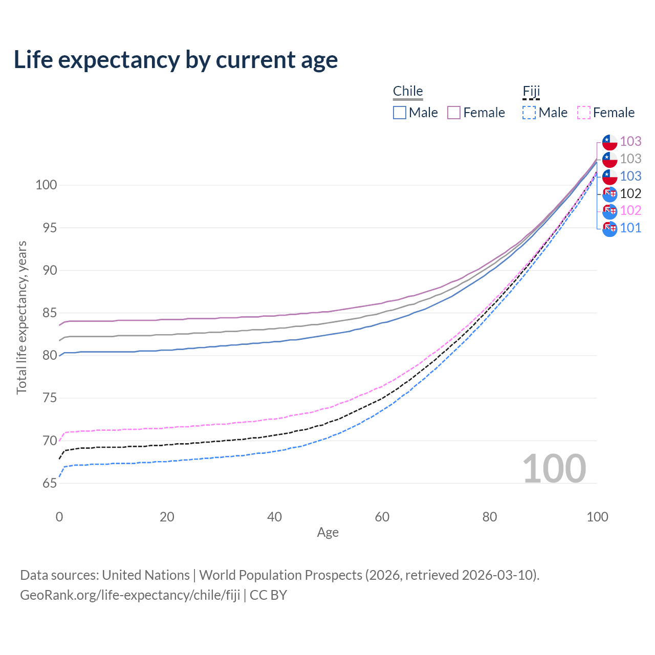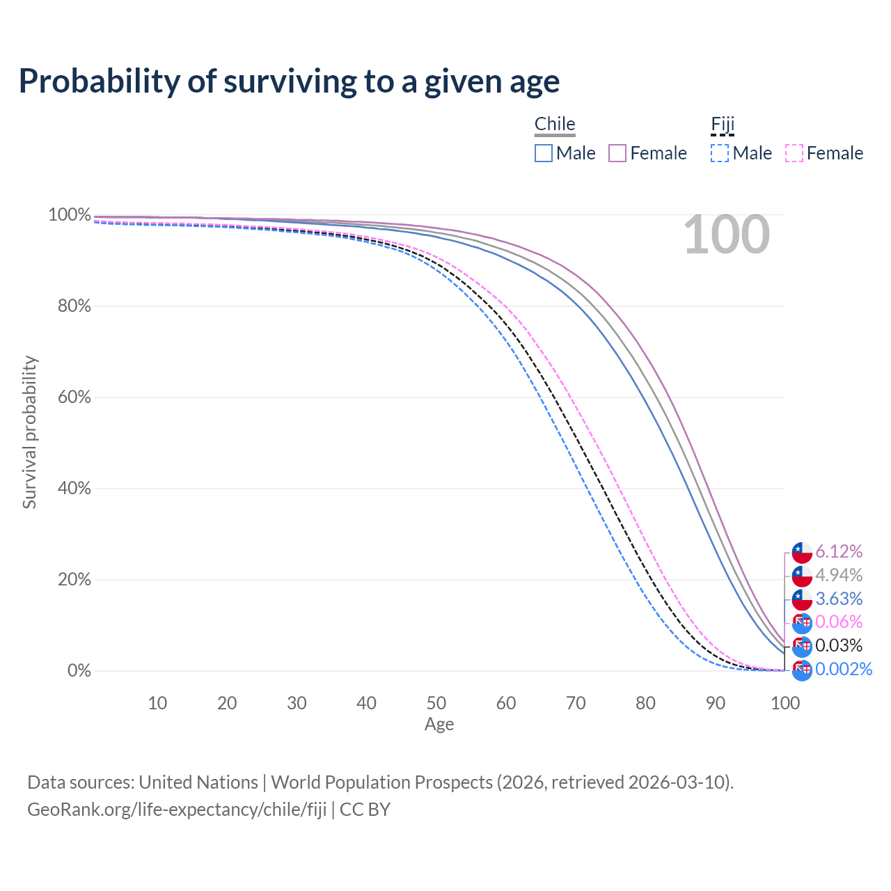 This life expectancy calculator shows the odds of living to 100, 95, 90, and below based on current age for both males and females in Chile and Fiji, along with mean and median age of death. The calculations are based on the 2026 life tables (actuarial tables) from the UN World Population Prospects.