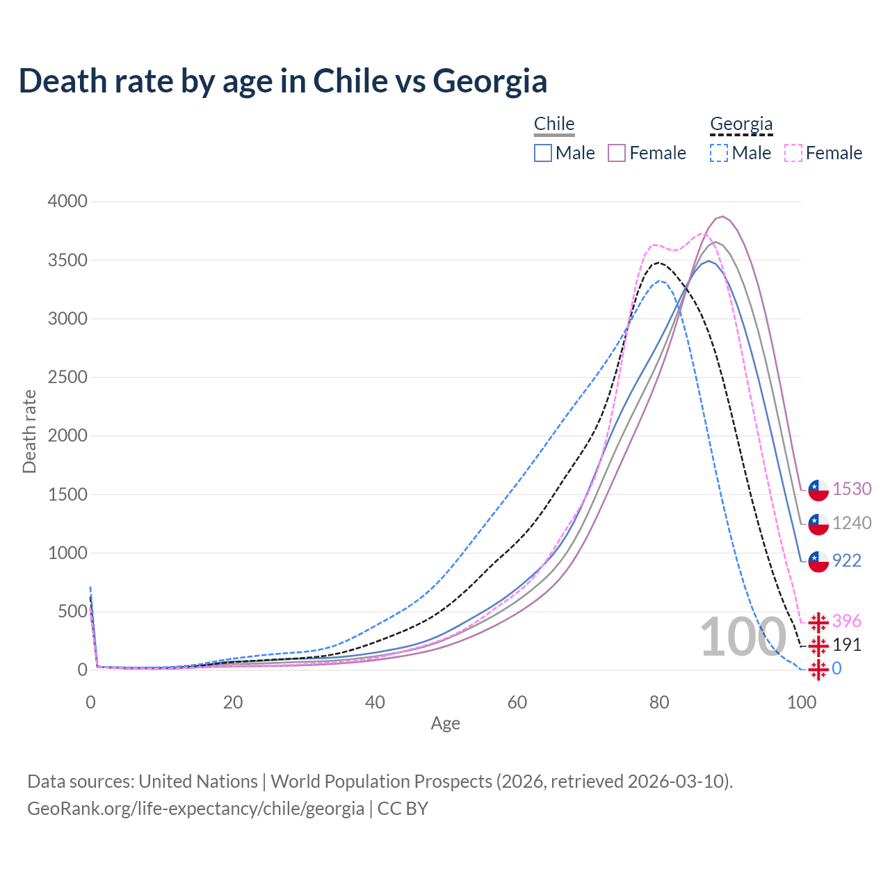 This life expectancy calculator shows the odds of living to 100, 95, 90, and below based on current age for both males and females in Chile and Georgia, along with mean and median age of death. The calculations are based on the 2026 life tables (actuarial tables) from the UN World Population Prospects.