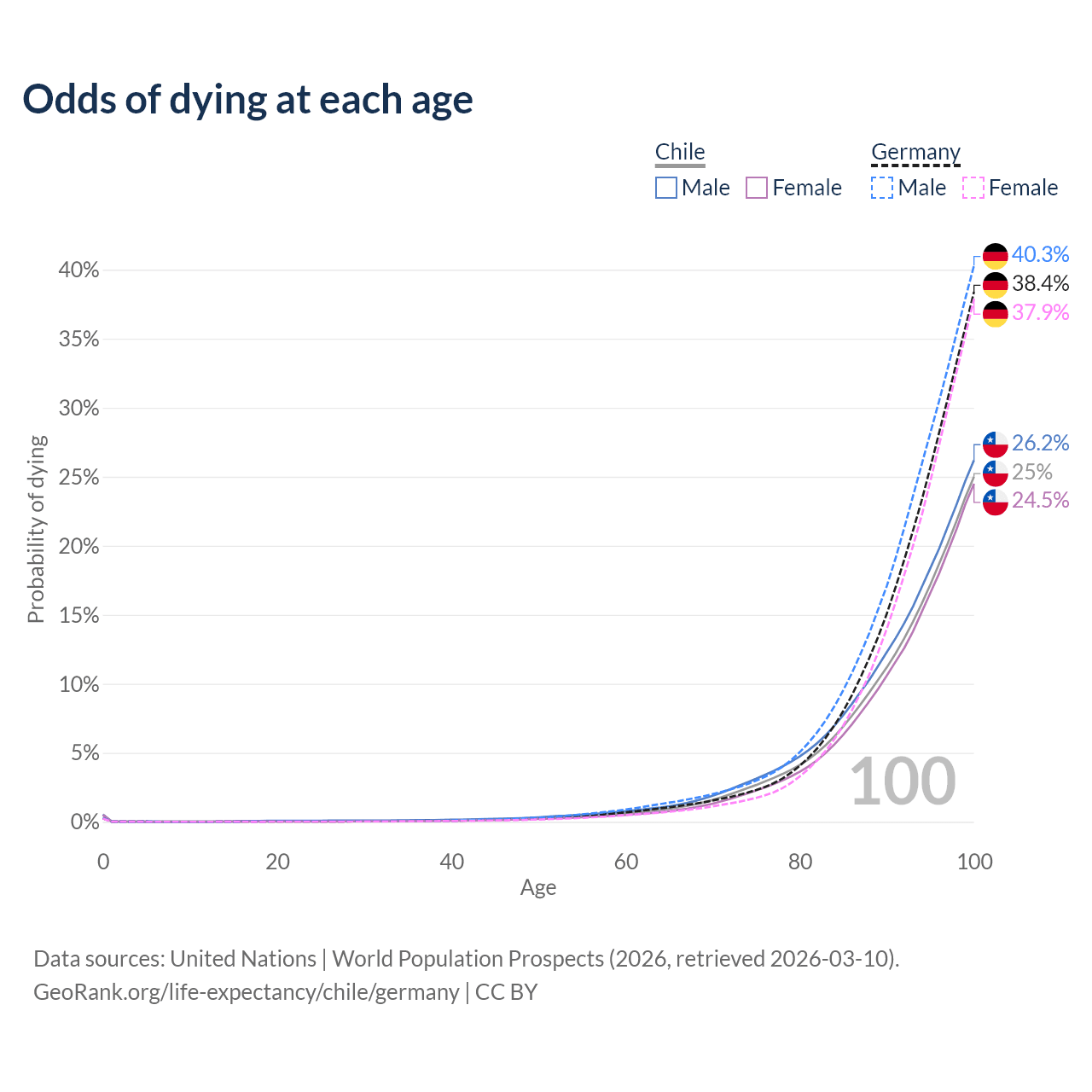 This life expectancy calculator shows the odds of living to 100, 95, 90, and below based on current age for both males and females in Chile and Germany, along with mean and median age of death. The calculations are based on the 2026 life tables (actuarial tables) from the UN World Population Prospects.