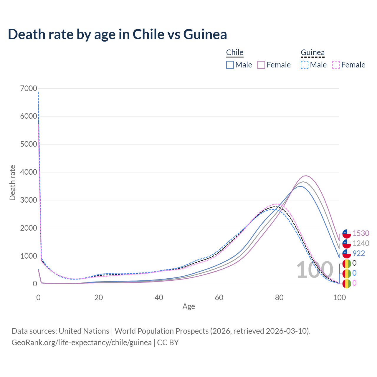 In Chile, the most common age of death is 88, compared to 0 in Guinea. The median age of death is 84.8 in Chile and 70.6 in Guinea, meaning only half of each cohort is expected to live past that age.
