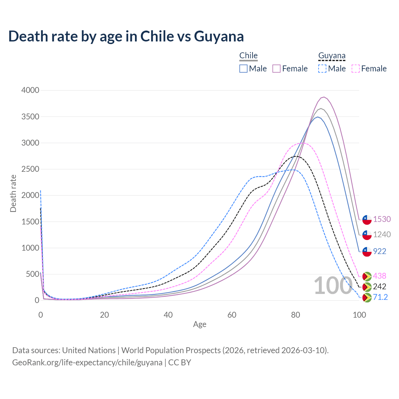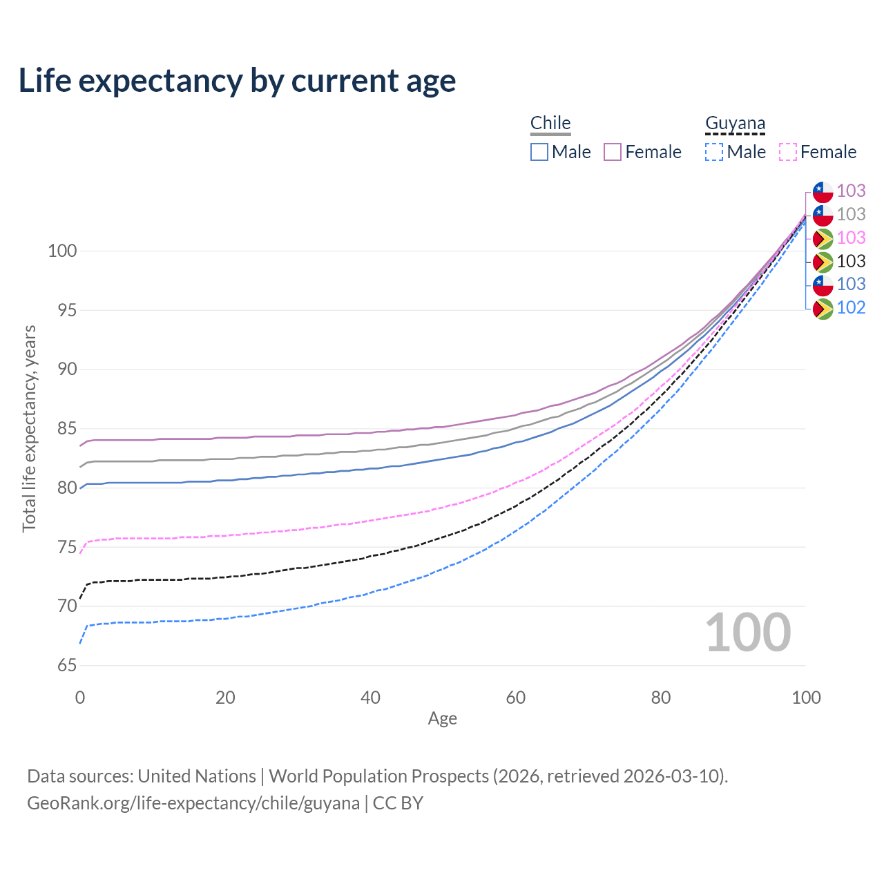This life expectancy calculator shows the odds of living to 100, 95, 90, and below based on current age for both males and females in Chile and Guyana, along with mean and median age of death. The calculations are based on the 2026 life tables (actuarial tables) from the UN World Population Prospects.