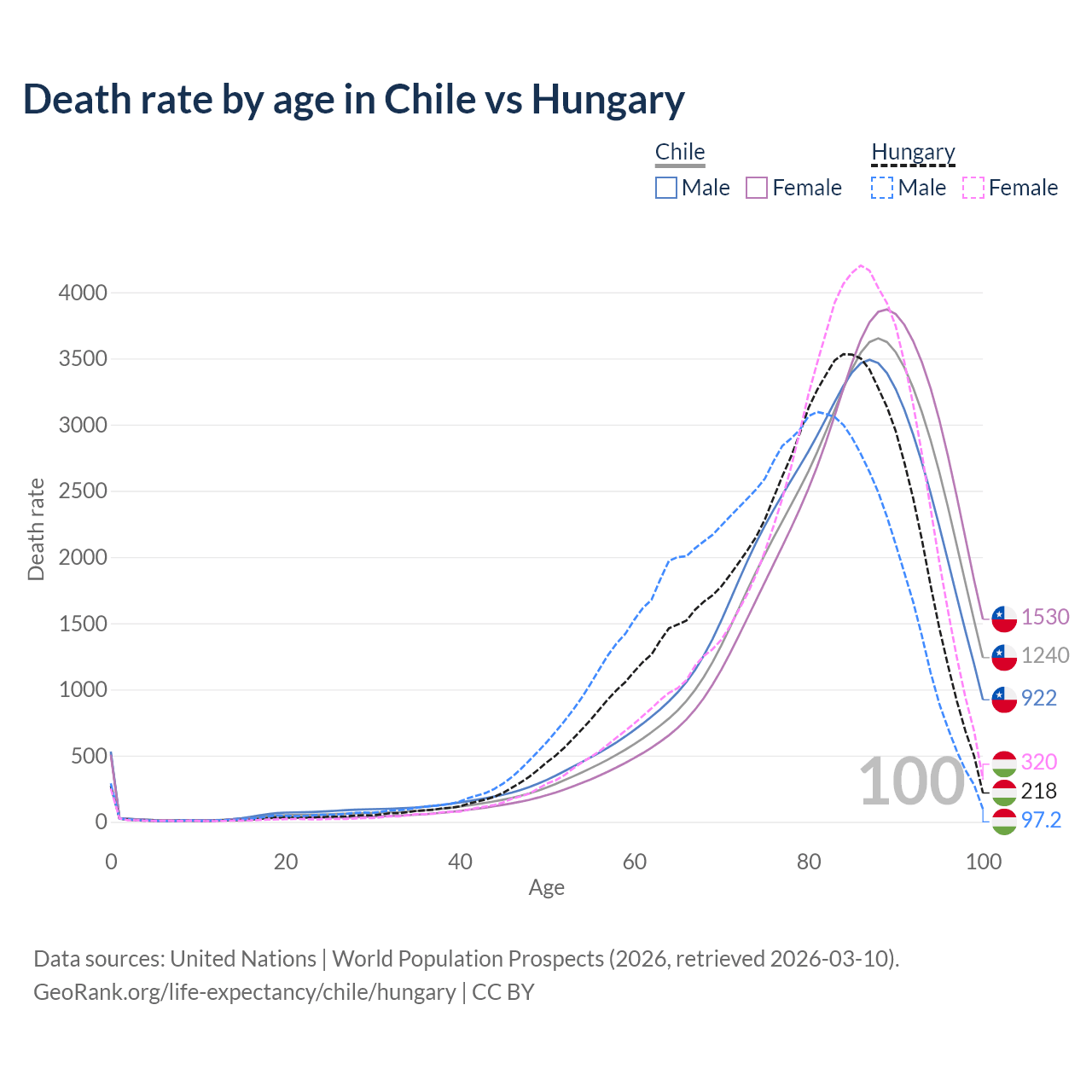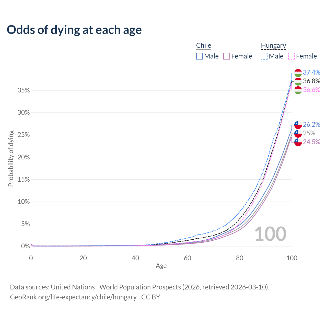 This life expectancy calculator shows the odds of living to 100, 95, 90, and below based on current age for both males and females in Chile and Hungary, along with mean and median age of death. The calculations are based on the 2026 life tables (actuarial tables) from the UN World Population Prospects.