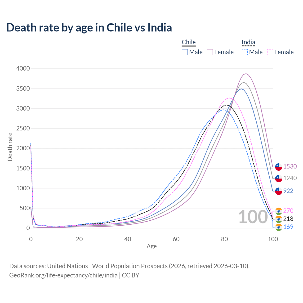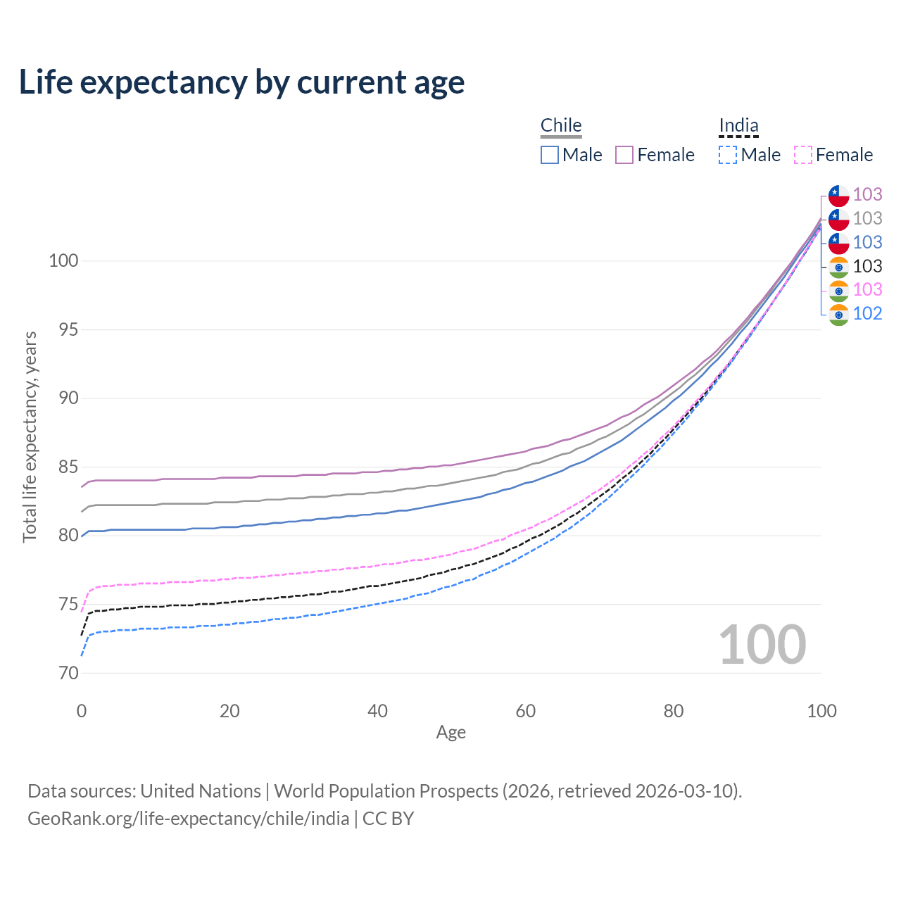 This life expectancy calculator shows the odds of living to 100, 95, 90, and below based on current age for both males and females in Chile and India, along with mean and median age of death. The calculations are based on the 2026 life tables (actuarial tables) from the UN World Population Prospects.