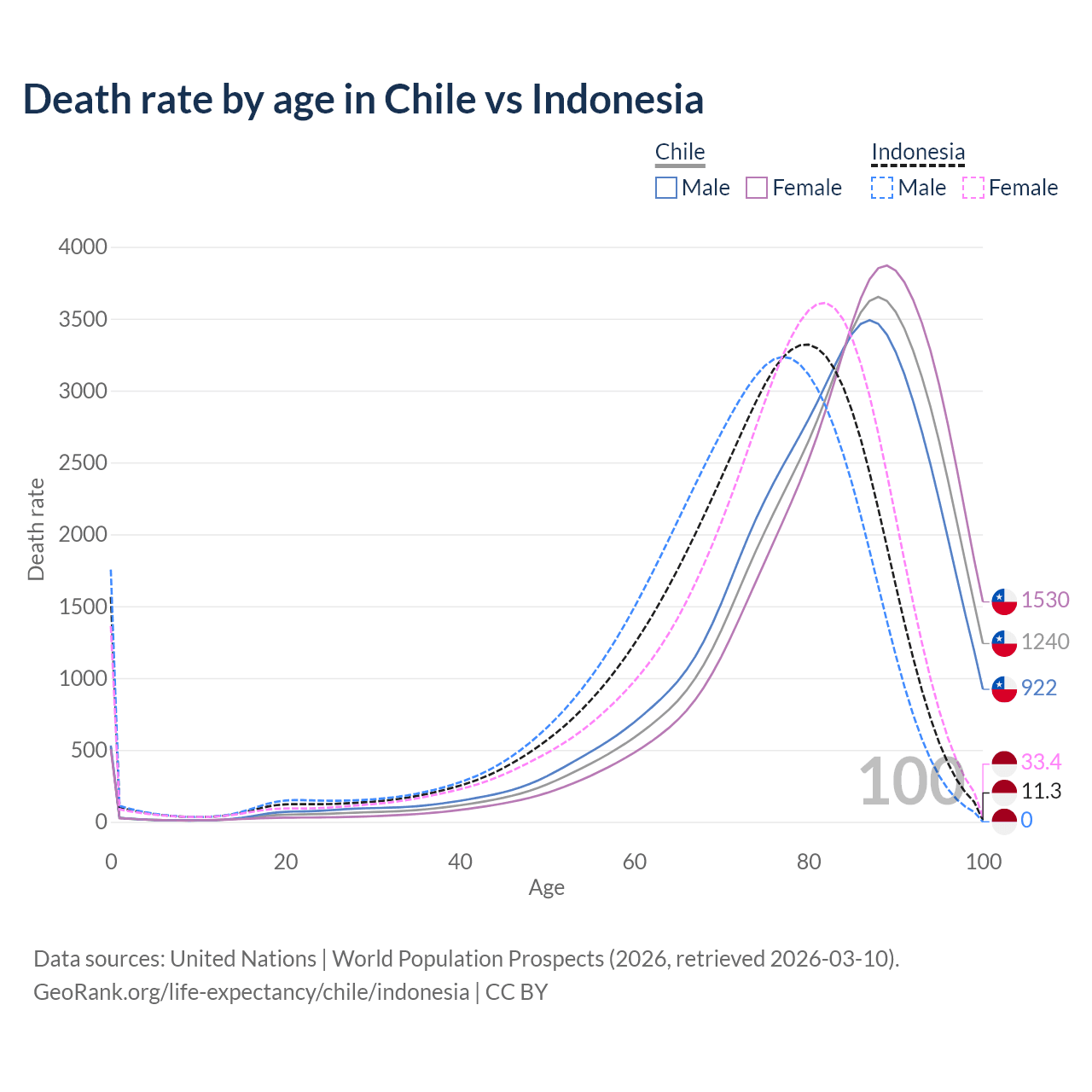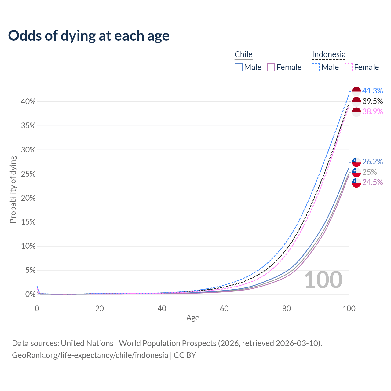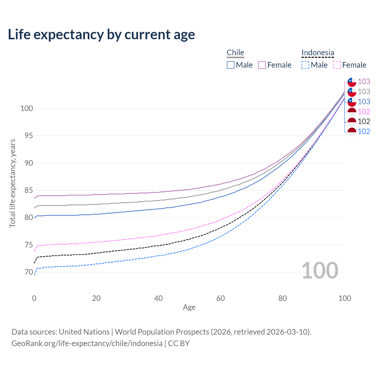 This life expectancy calculator shows the odds of living to 100, 95, 90, and below based on current age for both males and females in Chile and Indonesia, along with mean and median age of death. The calculations are based on the 2026 life tables (actuarial tables) from the UN World Population Prospects.