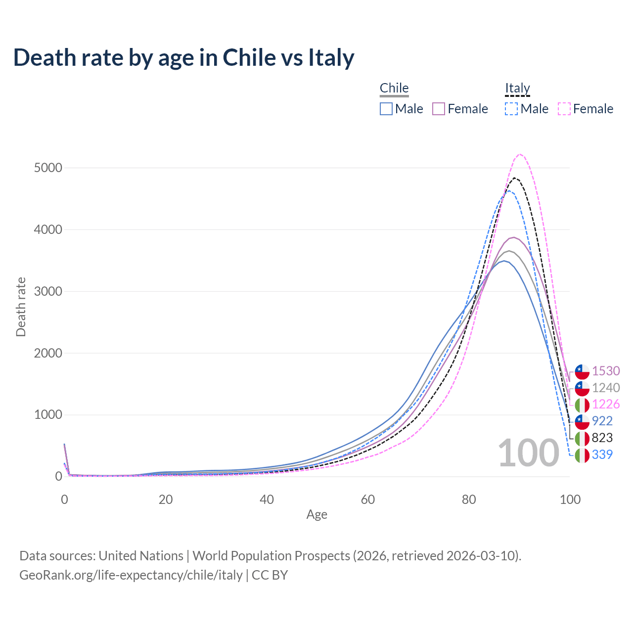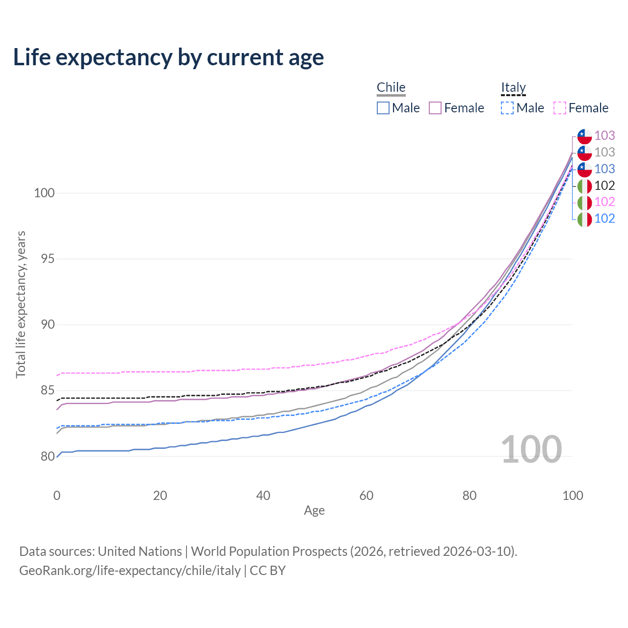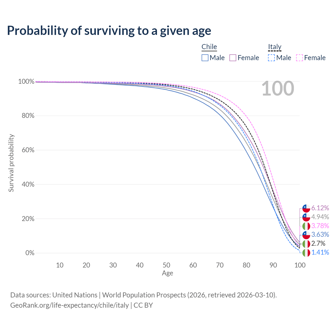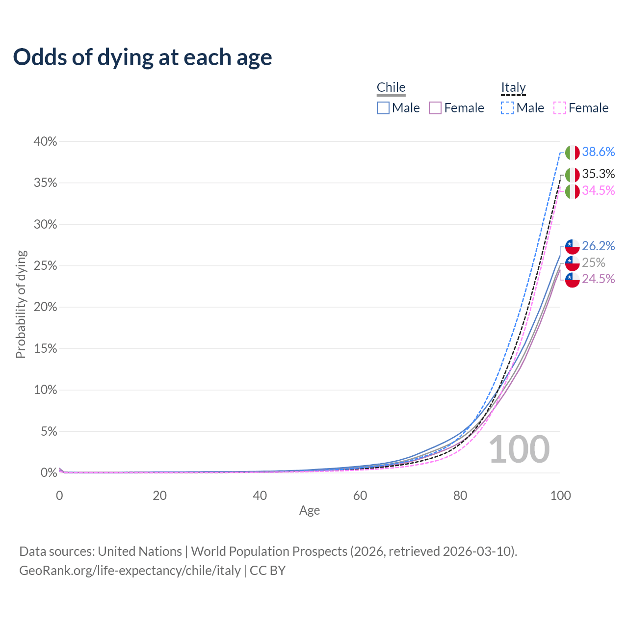 This life expectancy calculator shows the odds of living to 100, 95, 90, and below based on current age for both males and females in Chile and Italy, along with mean and median age of death. The calculations are based on the 2026 life tables (actuarial tables) from the UN World Population Prospects.