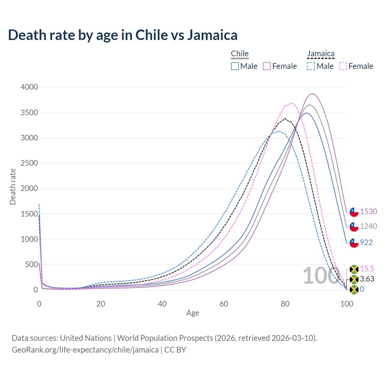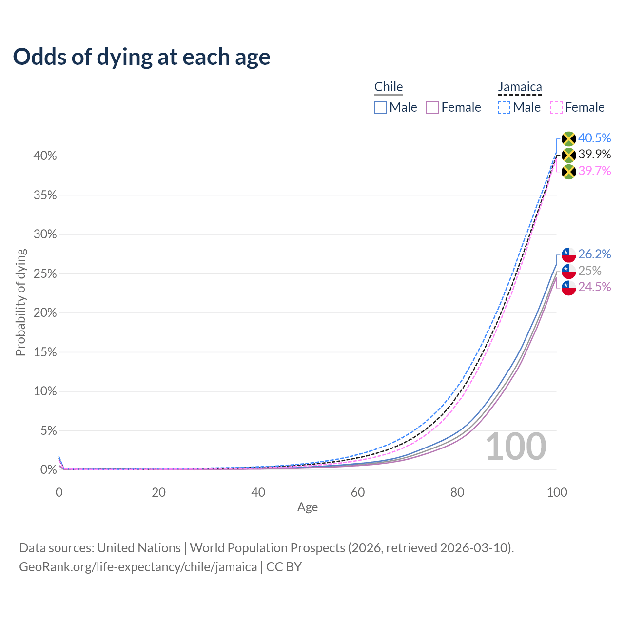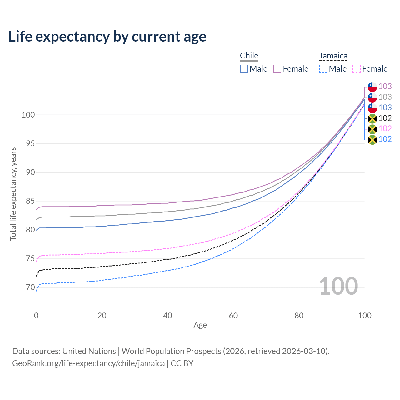 This life expectancy calculator shows the odds of living to 100, 95, 90, and below based on current age for both males and females in Chile and Jamaica, along with mean and median age of death. The calculations are based on the 2026 life tables (actuarial tables) from the UN World Population Prospects.