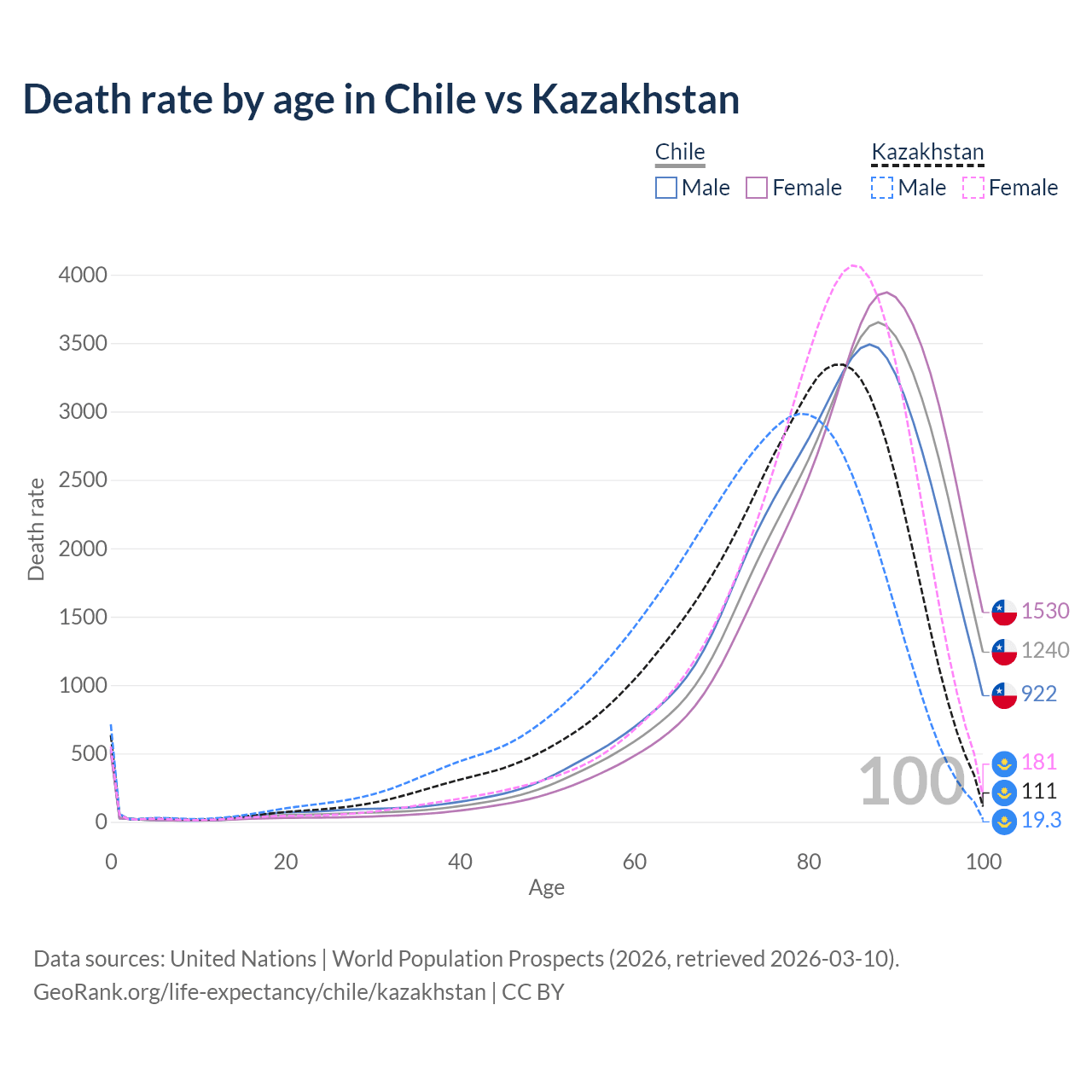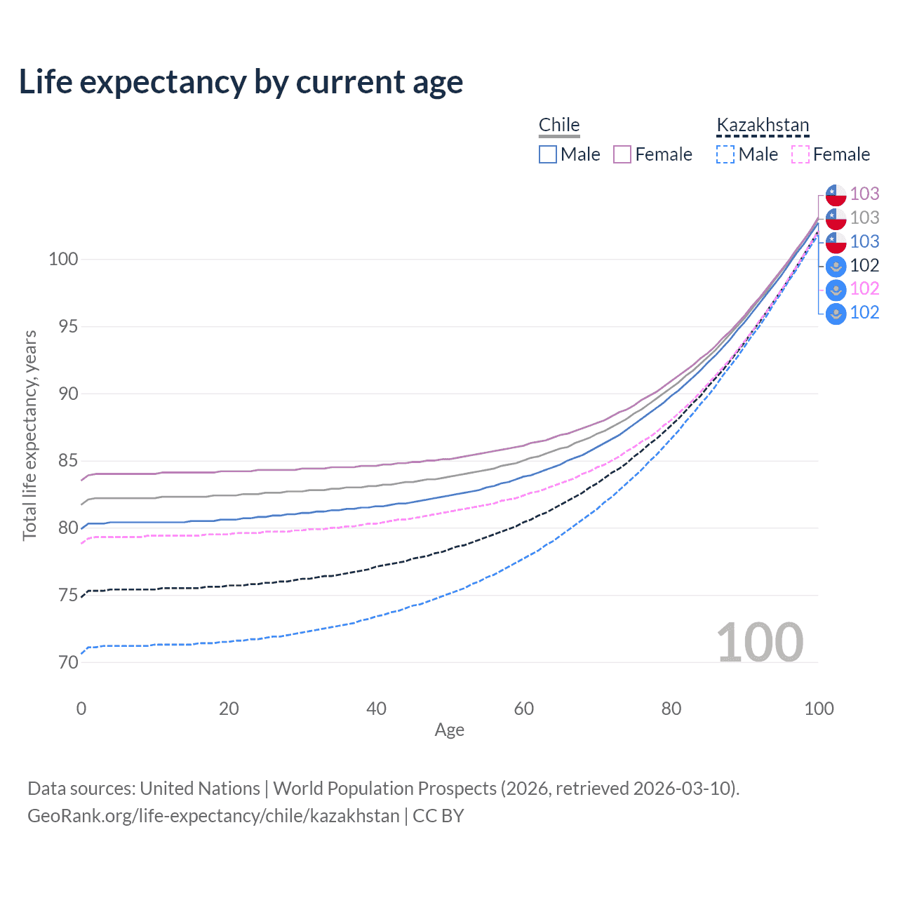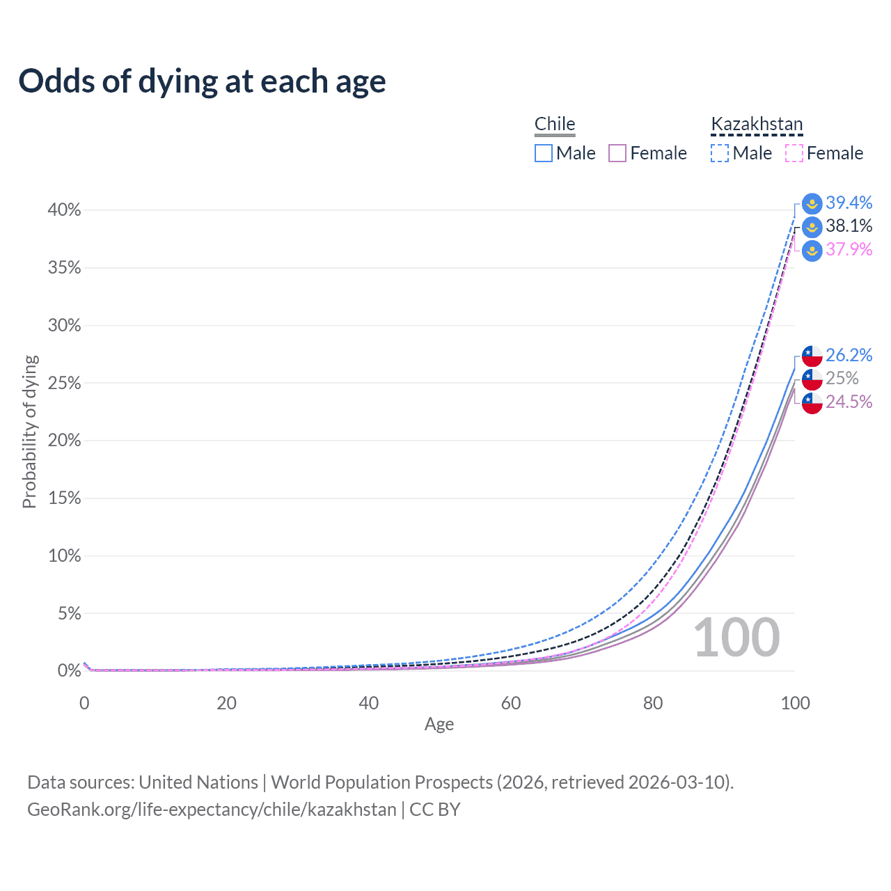 This life expectancy calculator shows the odds of living to 100, 95, 90, and below based on current age for both males and females in Chile and Kazakhstan, along with mean and median age of death. The calculations are based on the 2026 life tables (actuarial tables) from the UN World Population Prospects.