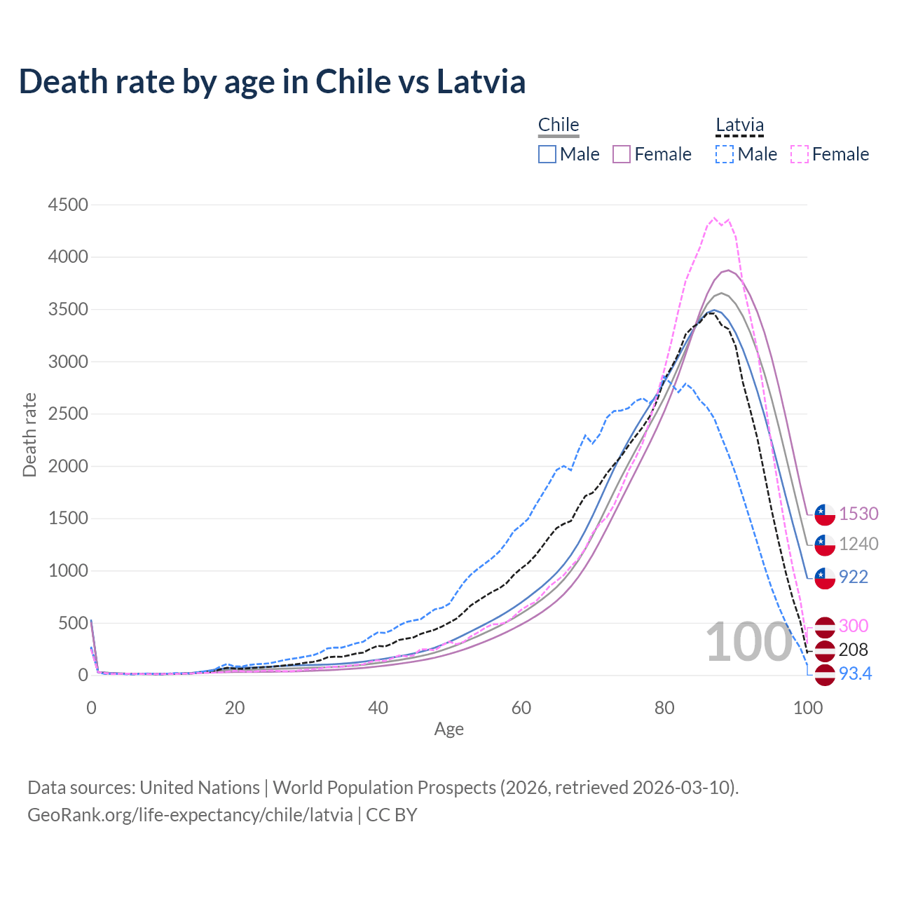 This life expectancy calculator shows the odds of living to 100, 95, 90, and below based on current age for both males and females in Chile and Latvia, along with mean and median age of death. The calculations are based on the 2026 life tables (actuarial tables) from the UN World Population Prospects.