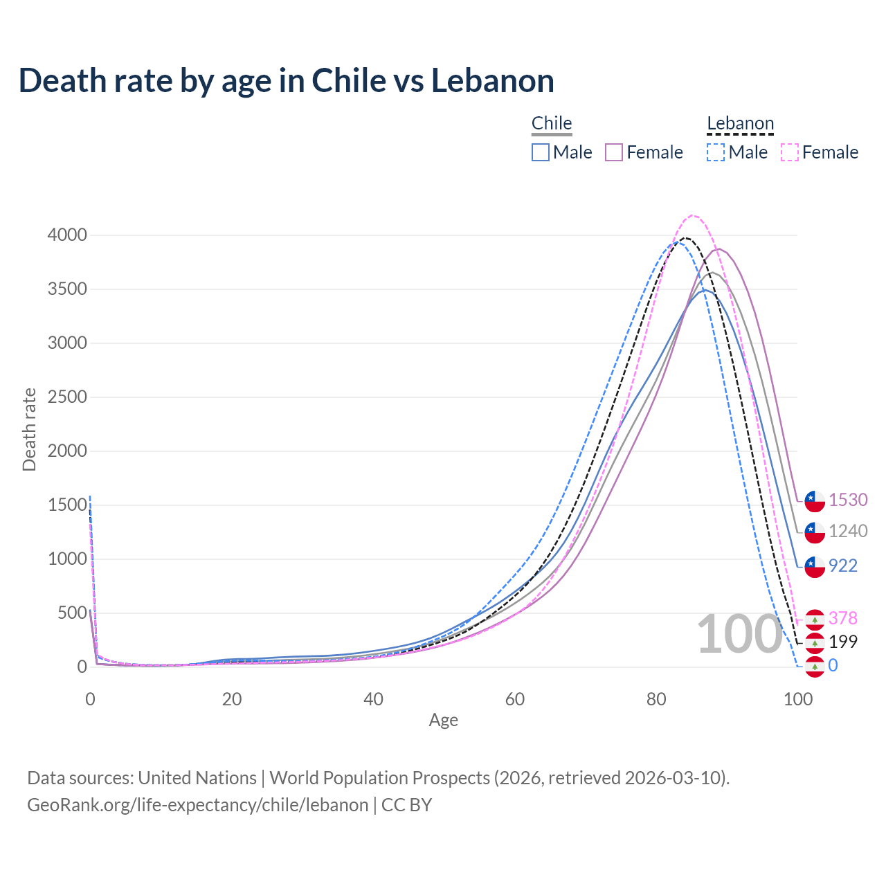 In Chile, the most common age of death is 88, compared to 84 in Lebanon. The median age of death is 84.8 in Chile and 81.6 in Lebanon, meaning only half of each cohort is expected to live past that age.