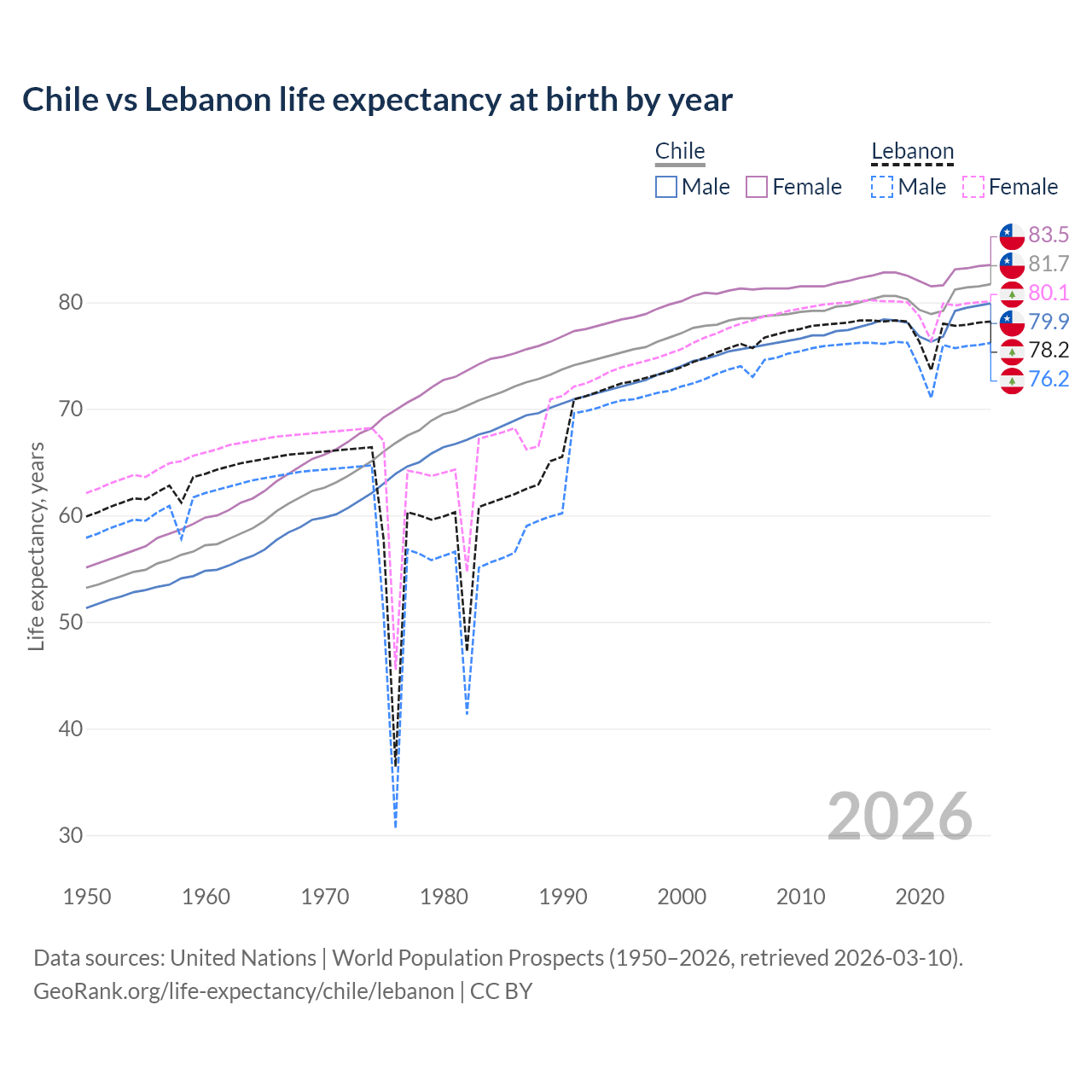 The average life expectancy at birth is 81.7 years in Chile vs 78.2 in Lebanon. Chile is ranked 38/197 by life expectancy, and Lebanon is 62/197. In Chile, the life expectancy is 79.9 years for males and 83.5 years for females. In Lebanon, it's 76.2 years for males and 80.1 years for females.