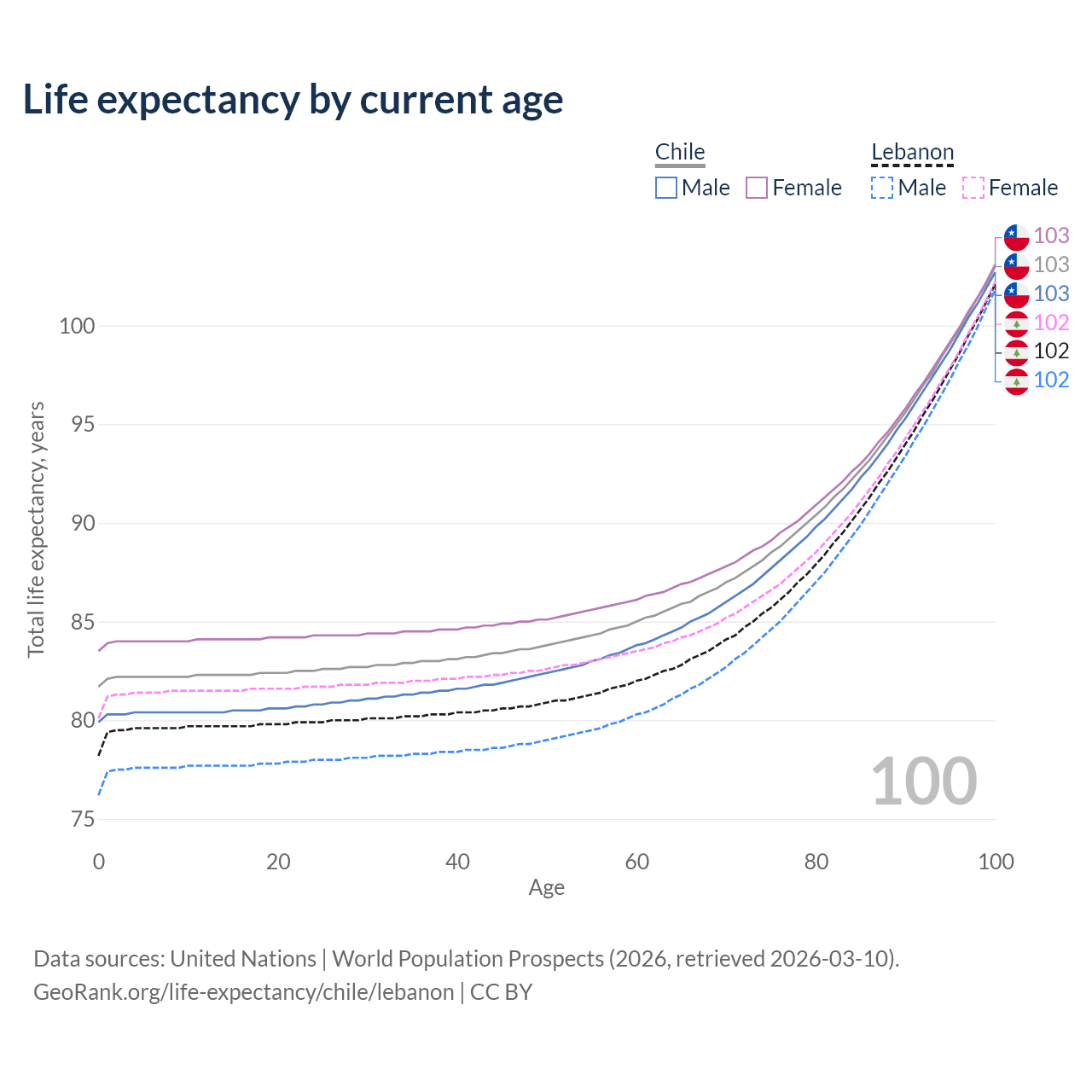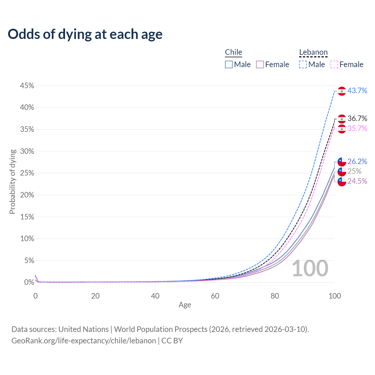 This life expectancy calculator shows the odds of living to 100, 95, 90, and below based on current age for both males and females in Chile and Lebanon, along with mean and median age of death. The calculations are based on the 2026 life tables (actuarial tables) from the UN World Population Prospects.