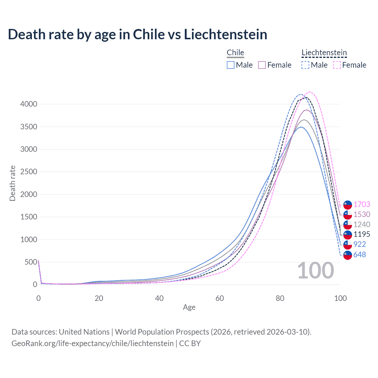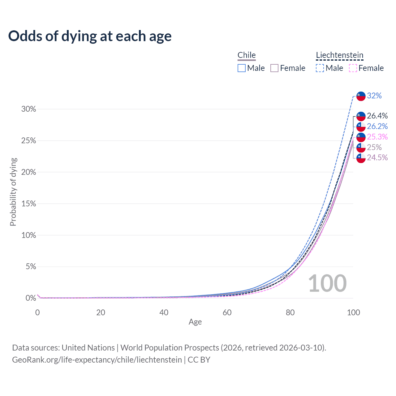 This life expectancy calculator shows the odds of living to 100, 95, 90, and below based on current age for both males and females in Chile and Liechtenstein, along with mean and median age of death. The calculations are based on the 2026 life tables (actuarial tables) from the UN World Population Prospects.
