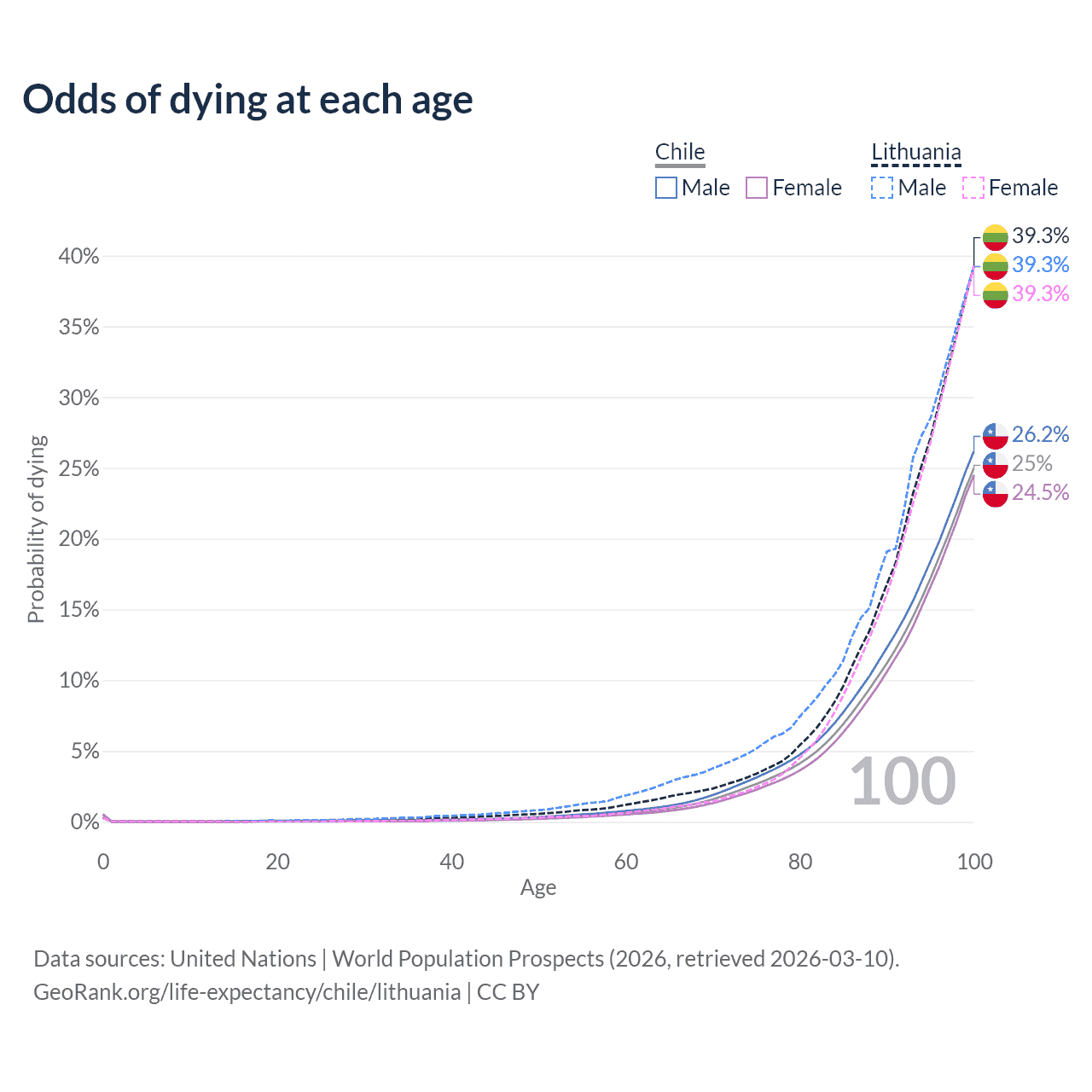 This life expectancy calculator shows the odds of living to 100, 95, 90, and below based on current age for both males and females in Chile and Lithuania, along with mean and median age of death. The calculations are based on the 2026 life tables (actuarial tables) from the UN World Population Prospects.