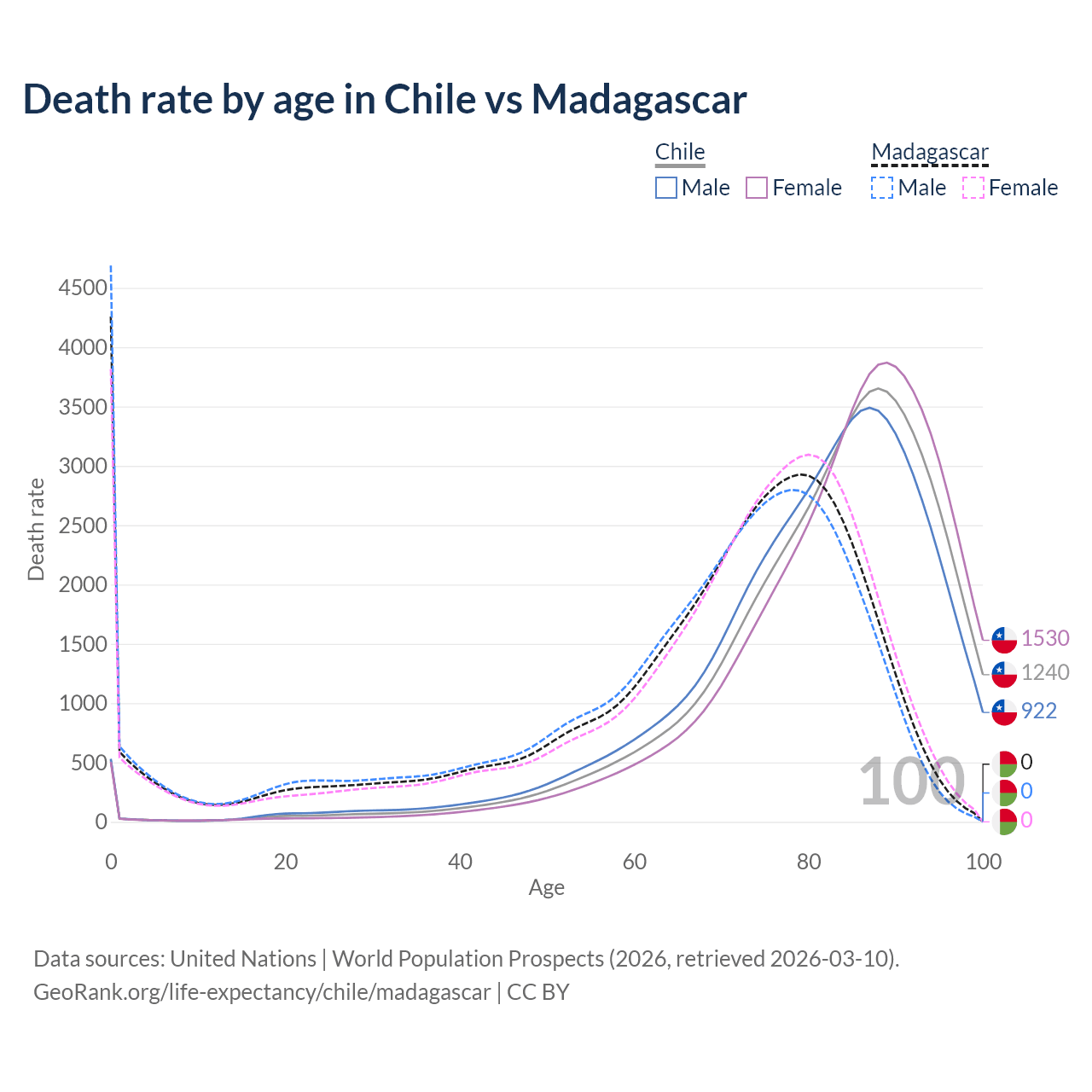 In Chile, the most common age of death is 88, compared to 0 in Madagascar. The median age of death is 84.8 in Chile and 72.2 in Madagascar, meaning only half of each cohort is expected to live past that age.