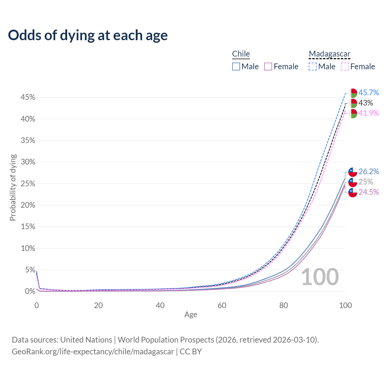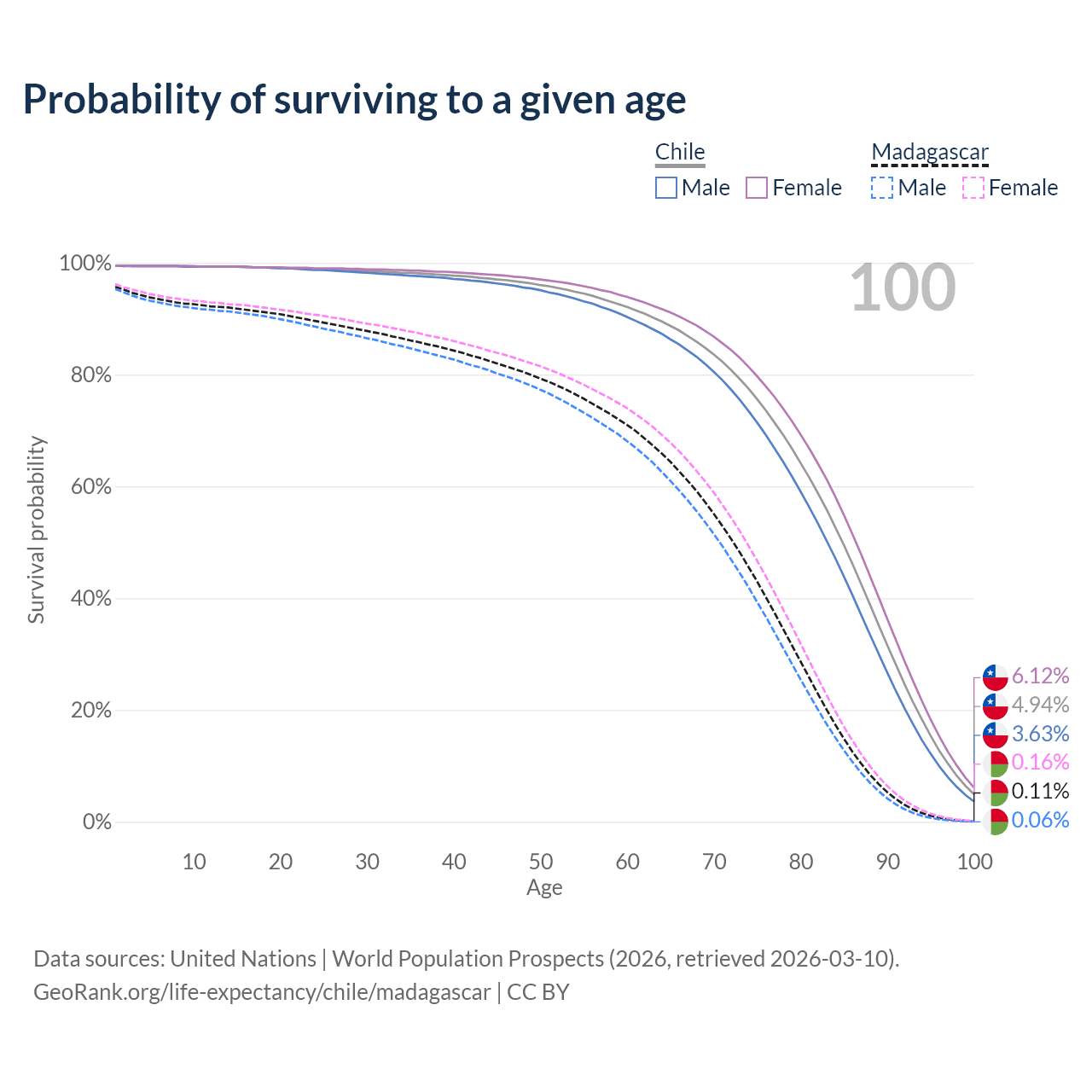 This life expectancy calculator shows the odds of living to 100, 95, 90, and below based on current age for both males and females in Chile and Madagascar, along with mean and median age of death. The calculations are based on the 2026 life tables (actuarial tables) from the UN World Population Prospects.