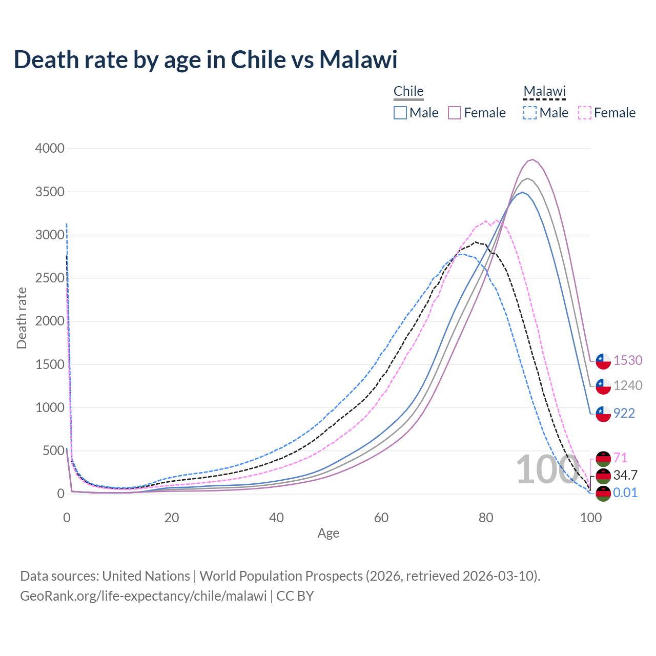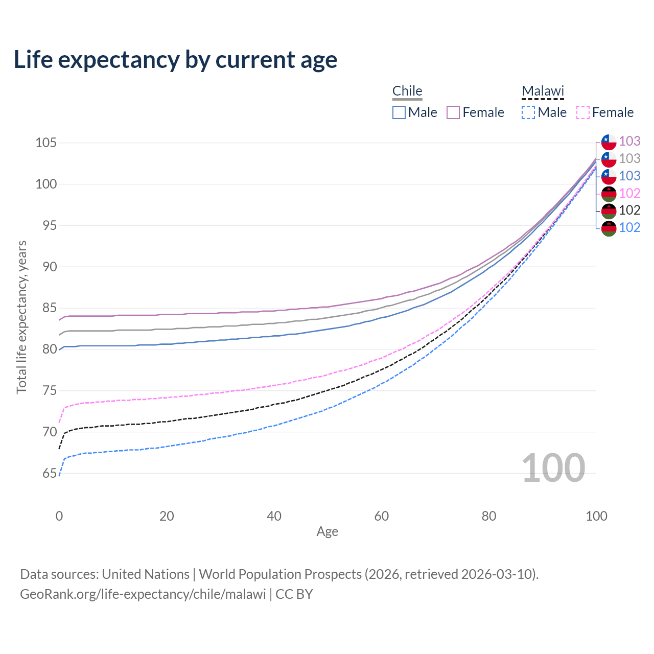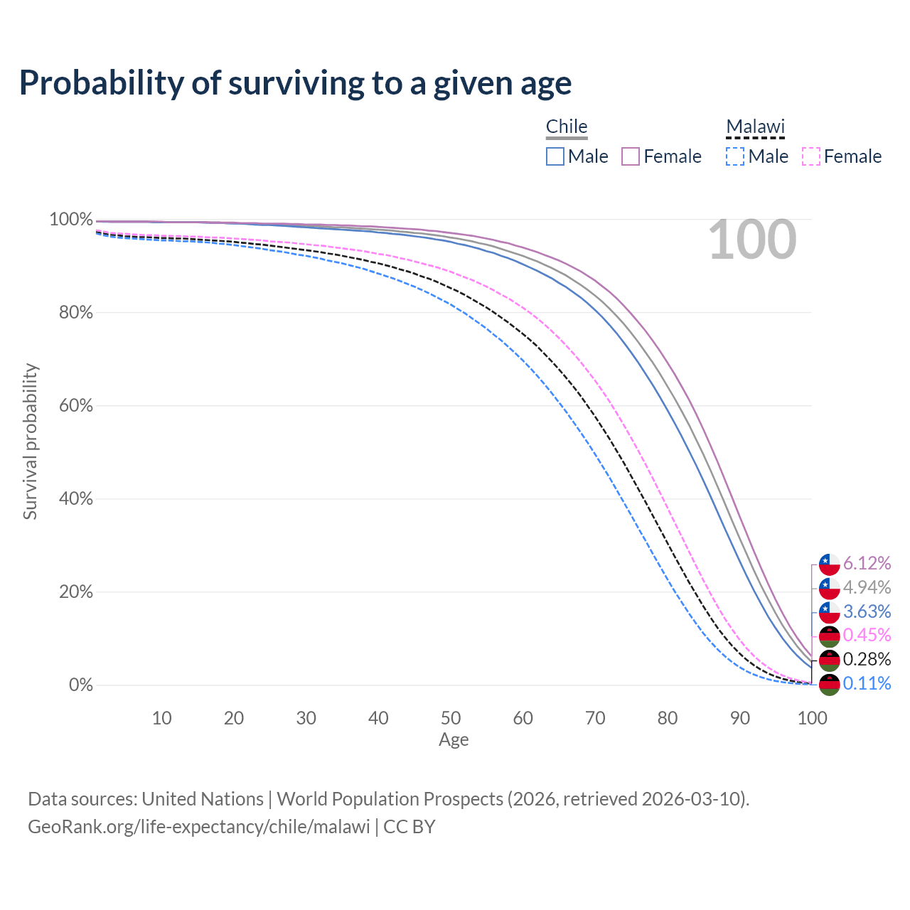 This life expectancy calculator shows the odds of living to 100, 95, 90, and below based on current age for both males and females in Chile and Malawi, along with mean and median age of death. The calculations are based on the 2026 life tables (actuarial tables) from the UN World Population Prospects.