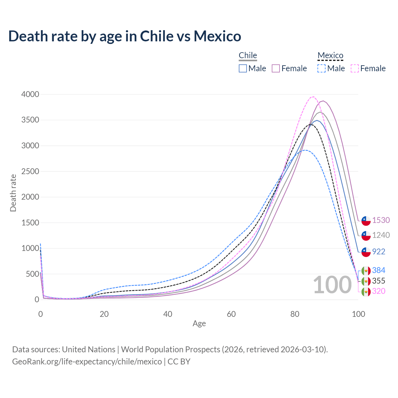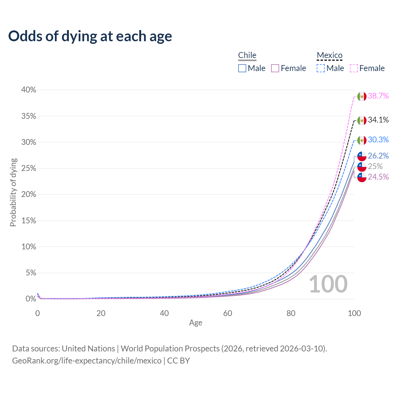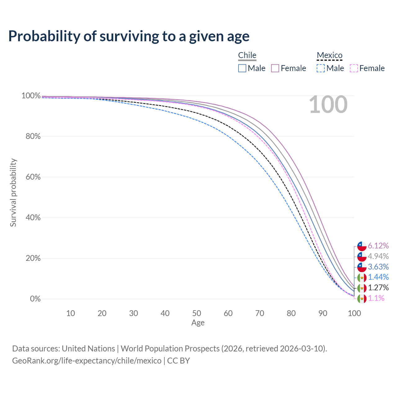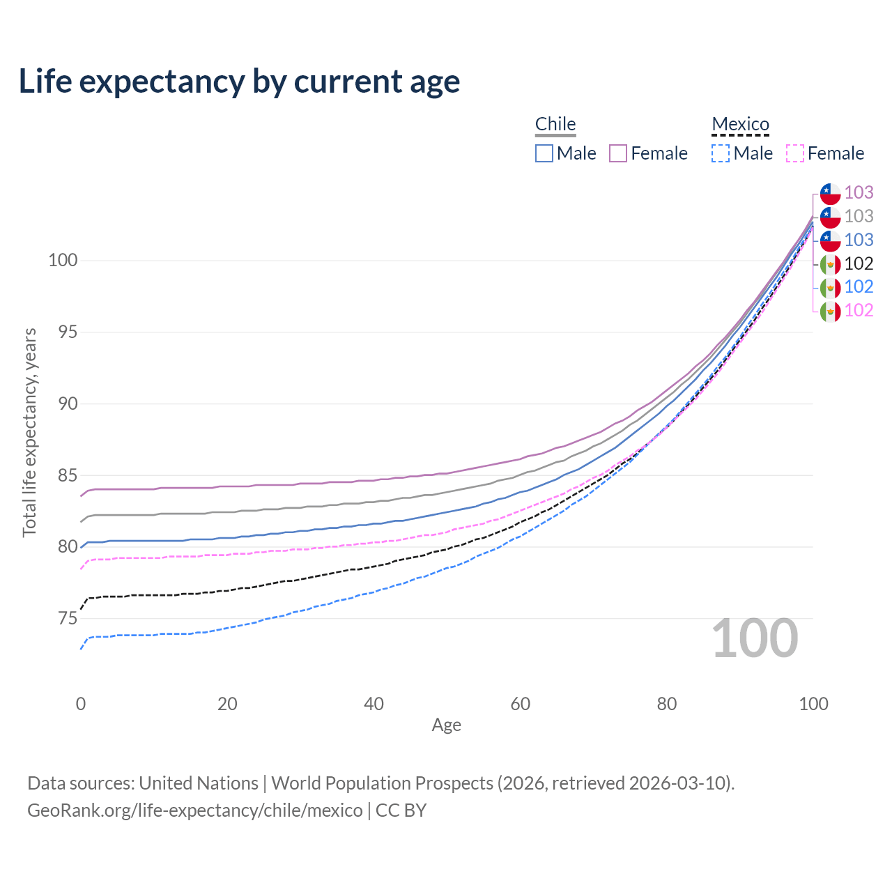 This life expectancy calculator shows the odds of living to 100, 95, 90, and below based on current age for both males and females in Chile and Mexico, along with mean and median age of death. The calculations are based on the 2026 life tables (actuarial tables) from the UN World Population Prospects.