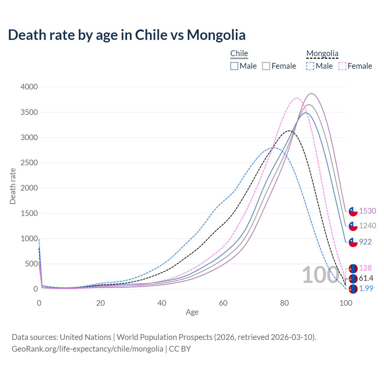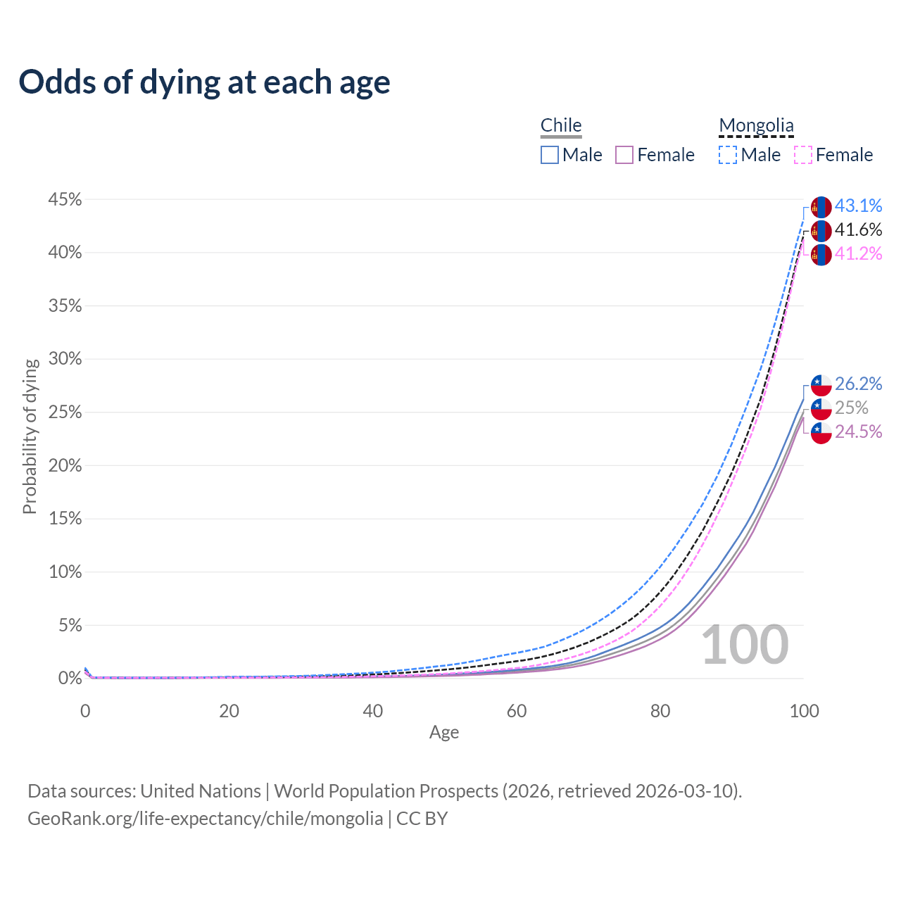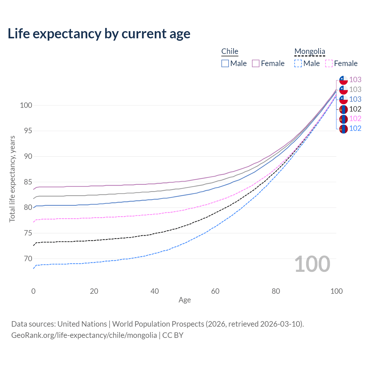 This life expectancy calculator shows the odds of living to 100, 95, 90, and below based on current age for both males and females in Chile and Mongolia, along with mean and median age of death. The calculations are based on the 2026 life tables (actuarial tables) from the UN World Population Prospects.