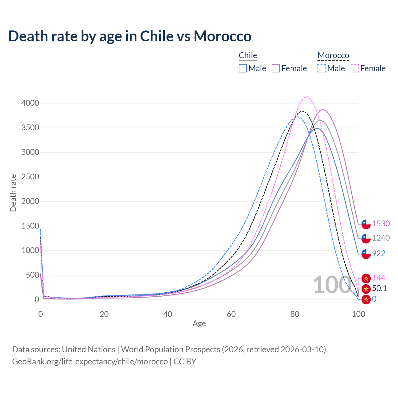 In Chile, the most common age of death is 88, compared to 82 in Morocco. The median age of death is 84.8 in Chile and 79.3 in Morocco, meaning only half of each cohort is expected to live past that age.