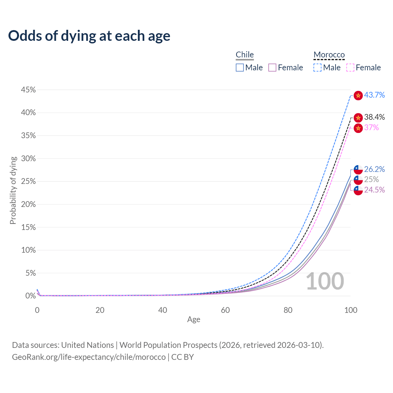This life expectancy calculator shows the odds of living to 100, 95, 90, and below based on current age for both males and females in Chile and Morocco, along with mean and median age of death. The calculations are based on the 2026 life tables (actuarial tables) from the UN World Population Prospects.