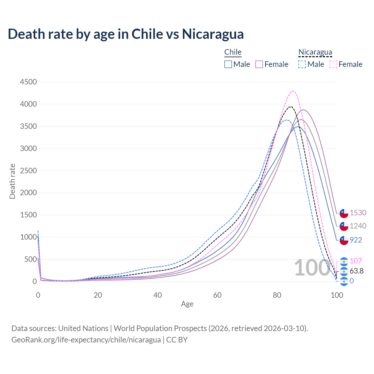 In Chile, the most common age of death is 88, compared to 85 in Nicaragua. The median age of death is 84.8 in Chile and 79.9 in Nicaragua, meaning only half of each cohort is expected to live past that age.