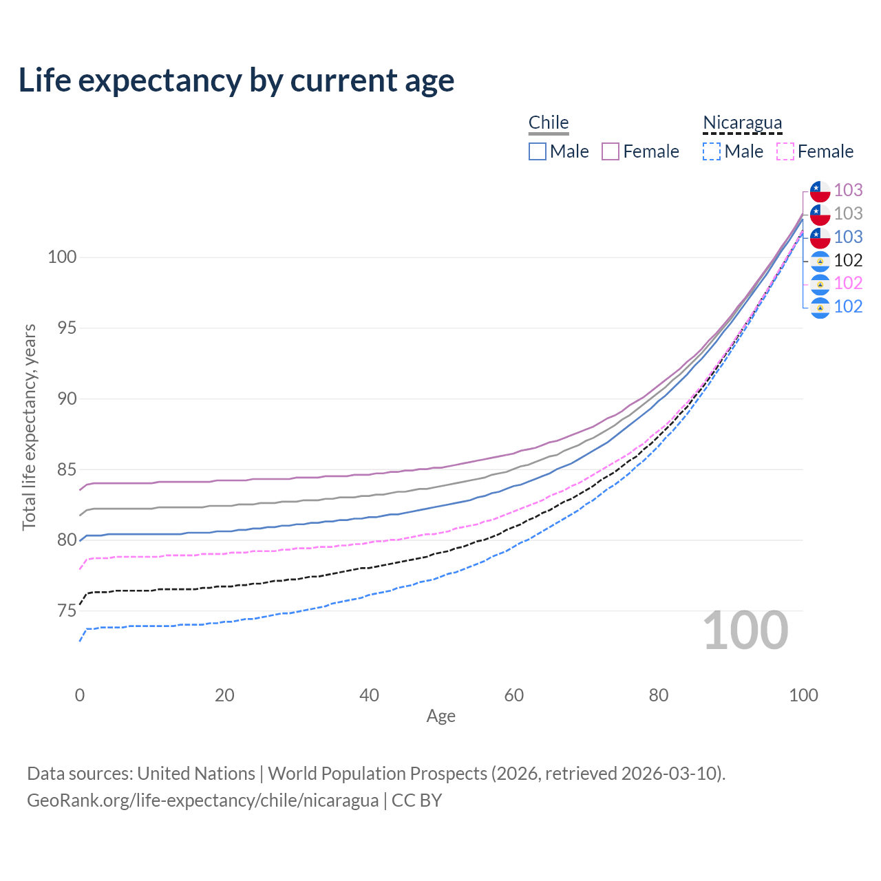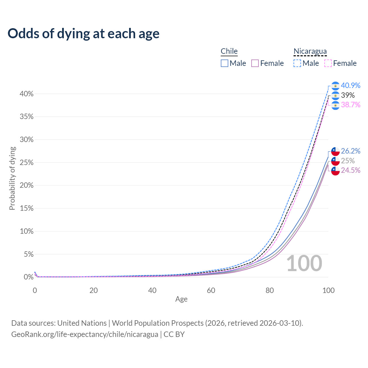 This life expectancy calculator shows the odds of living to 100, 95, 90, and below based on current age for both males and females in Chile and Nicaragua, along with mean and median age of death. The calculations are based on the 2026 life tables (actuarial tables) from the UN World Population Prospects.