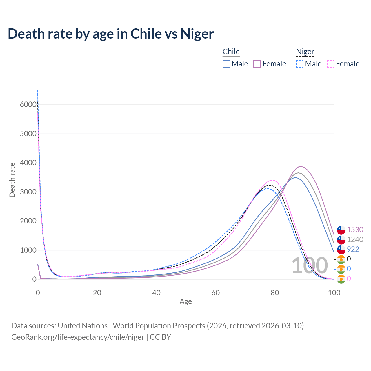 In Chile, the most common age of death is 88, compared to 0 in Niger. The median age of death is 84.8 in Chile and 71.7 in Niger, meaning only half of each cohort is expected to live past that age.