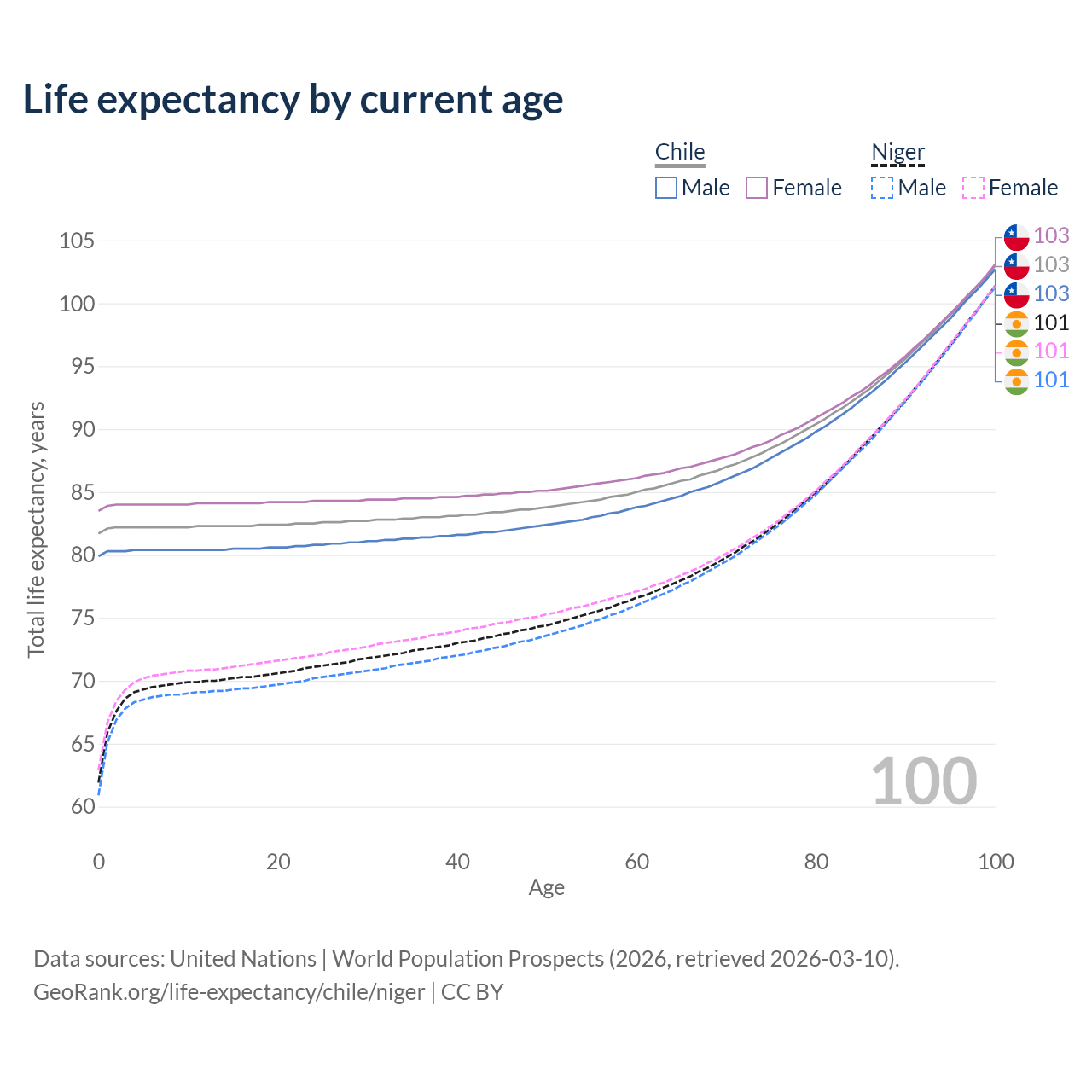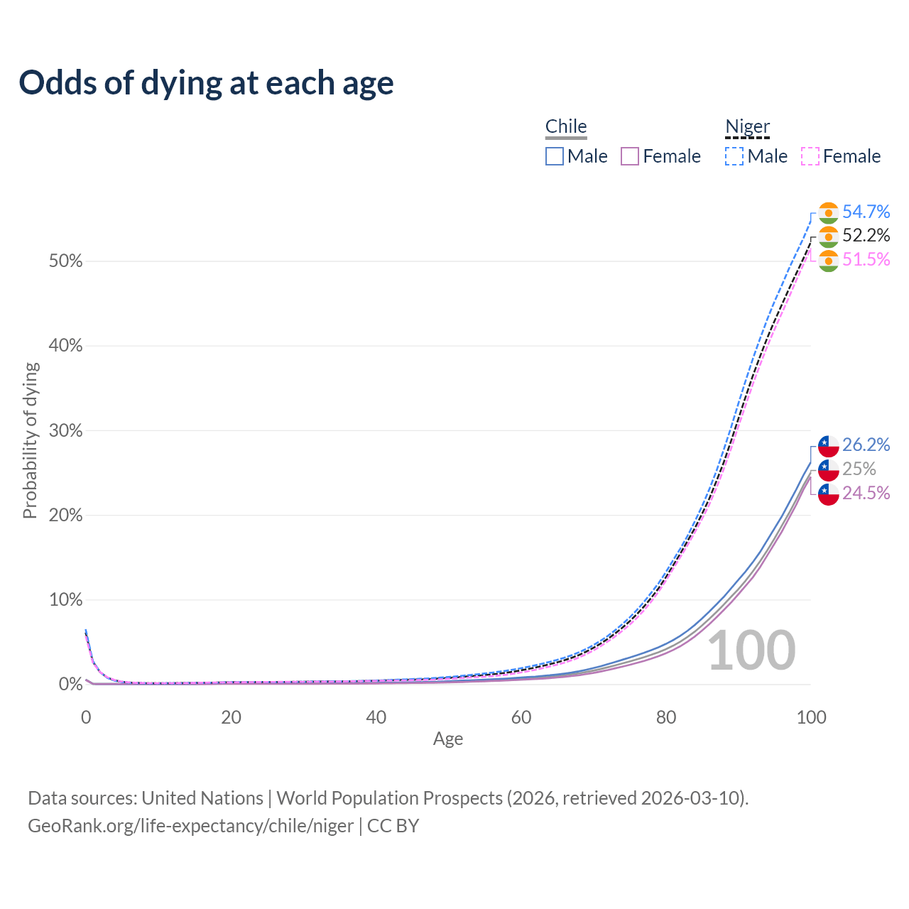 This life expectancy calculator shows the odds of living to 100, 95, 90, and below based on current age for both males and females in Chile and Niger, along with mean and median age of death. The calculations are based on the 2026 life tables (actuarial tables) from the UN World Population Prospects.