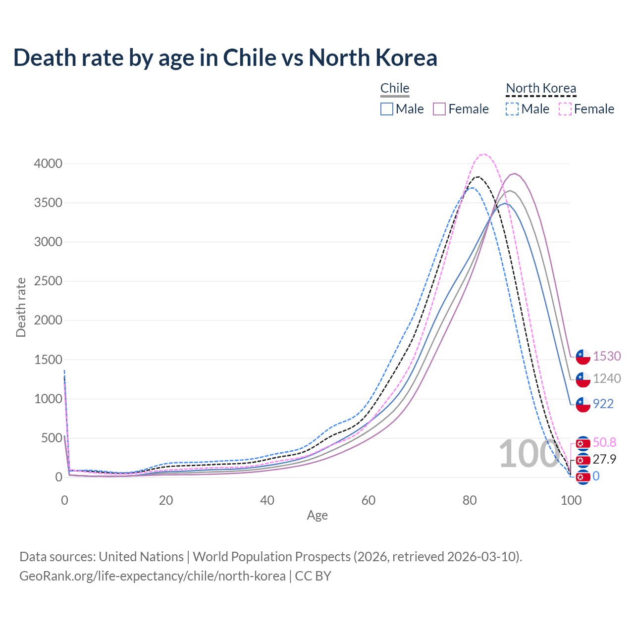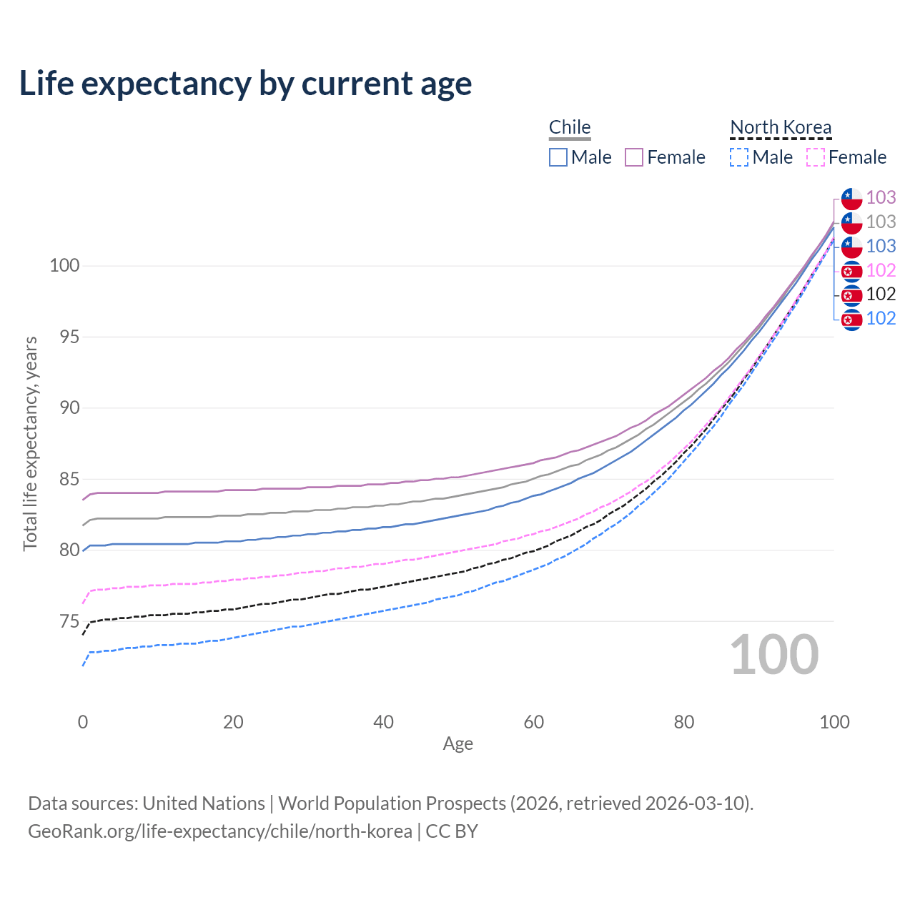 This life expectancy calculator shows the odds of living to 100, 95, 90, and below based on current age for both males and females in Chile and North Korea, along with mean and median age of death. The calculations are based on the 2026 life tables (actuarial tables) from the UN World Population Prospects.