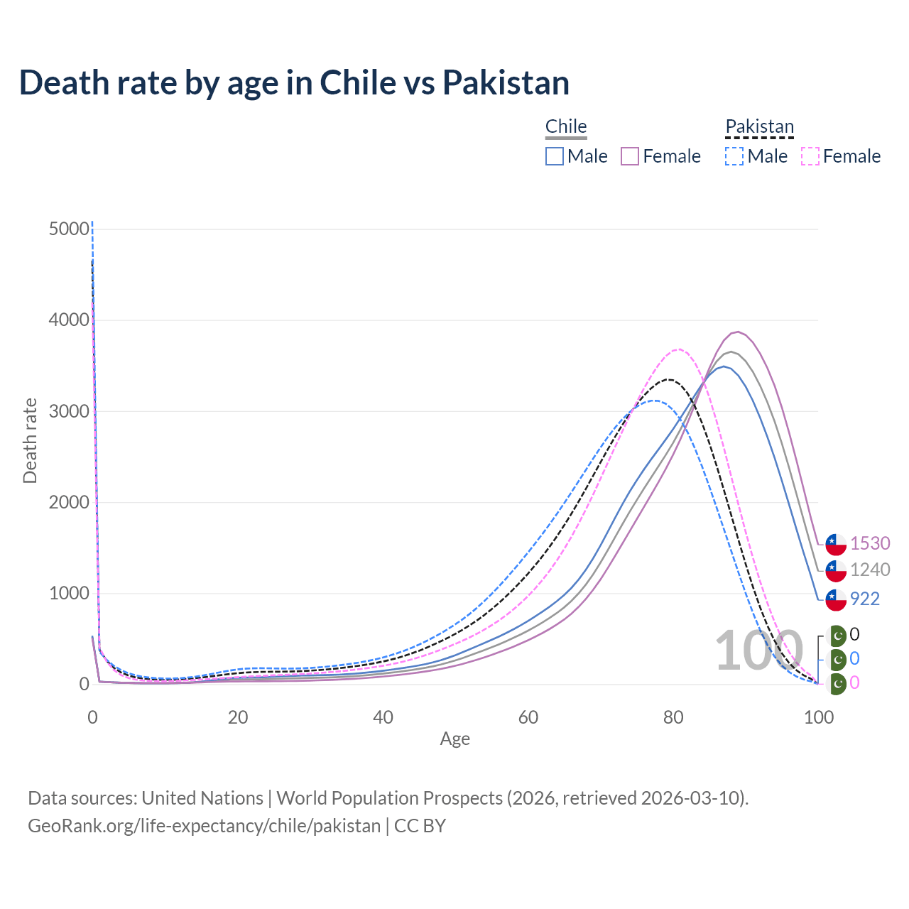 In Chile, the most common age of death is 88, compared to 0 in Pakistan. The median age of death is 84.8 in Chile and 74.3 in Pakistan, meaning only half of each cohort is expected to live past that age.
