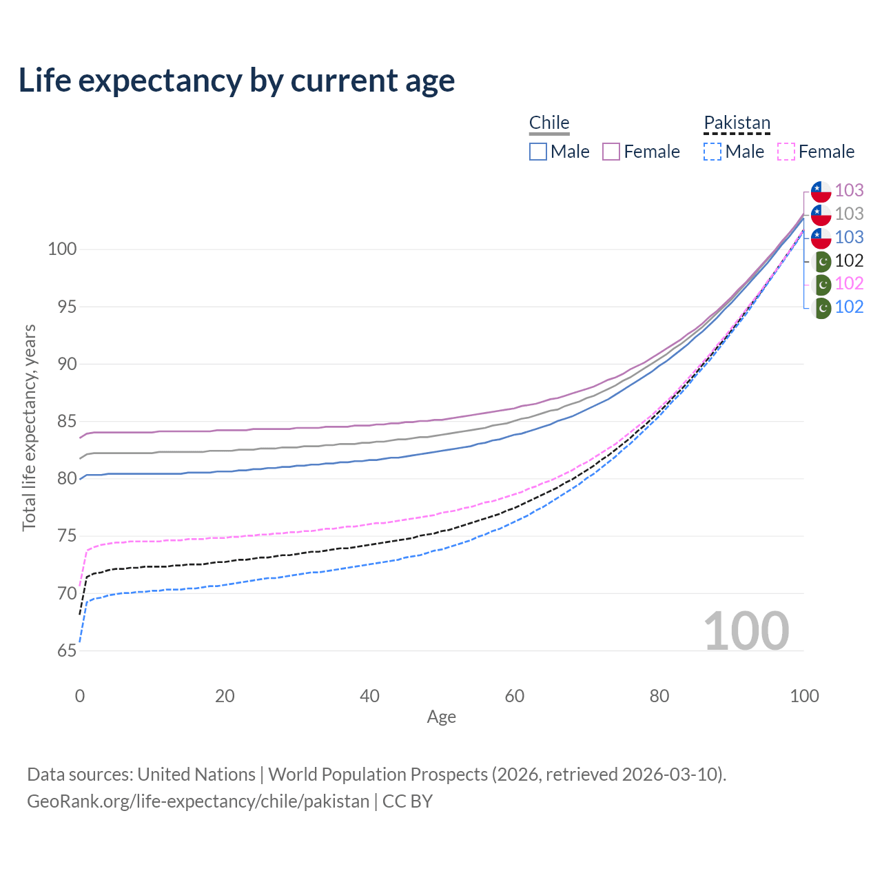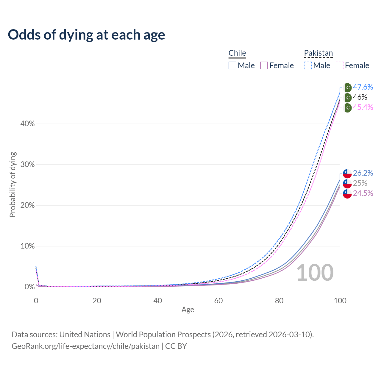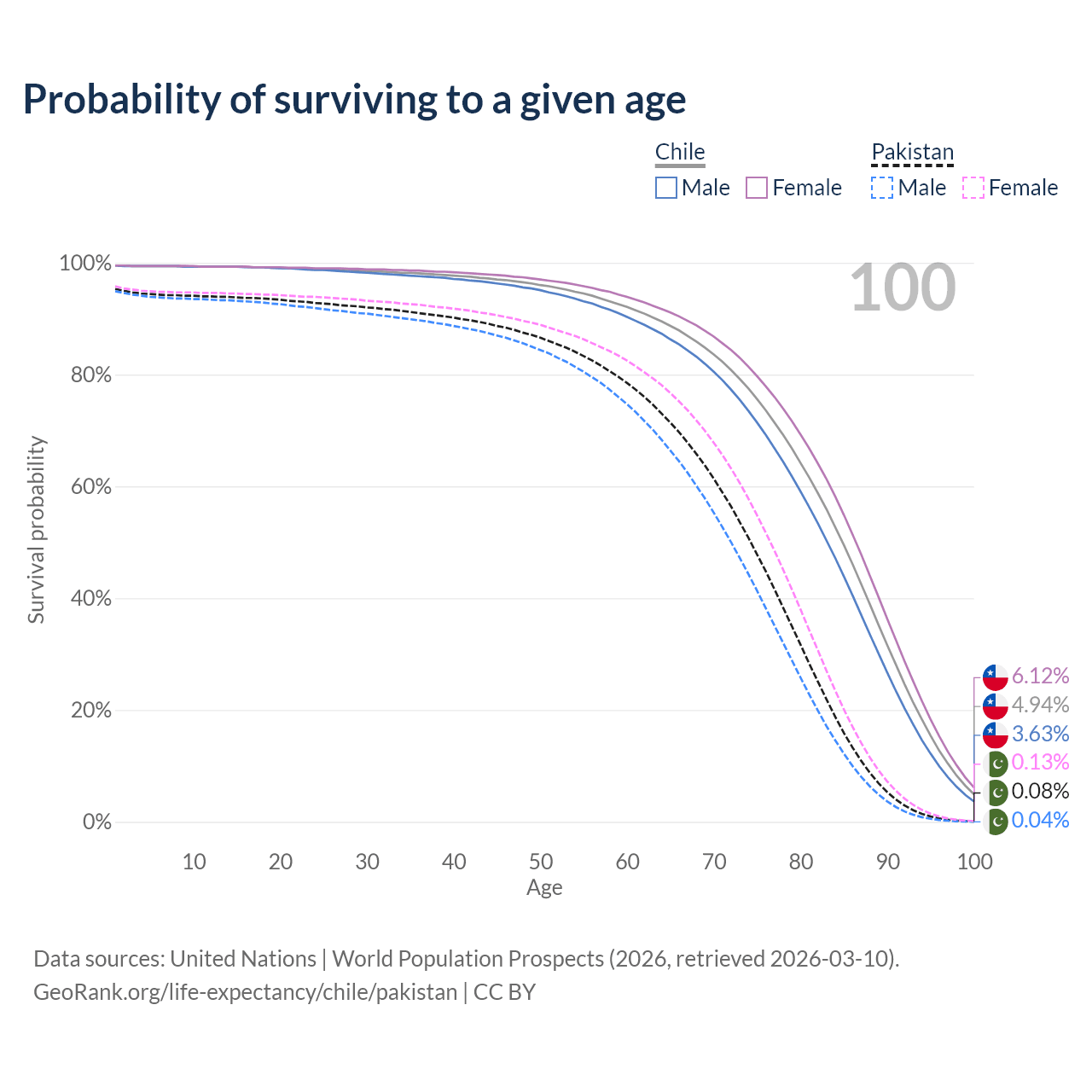 This life expectancy calculator shows the odds of living to 100, 95, 90, and below based on current age for both males and females in Chile and Pakistan, along with mean and median age of death. The calculations are based on the 2026 life tables (actuarial tables) from the UN World Population Prospects.
