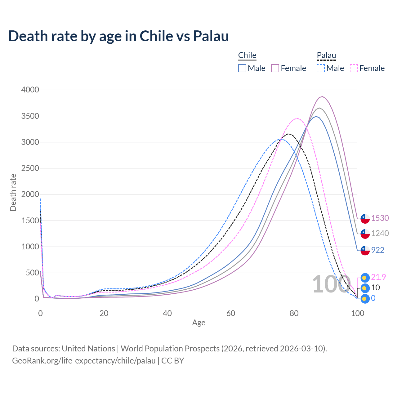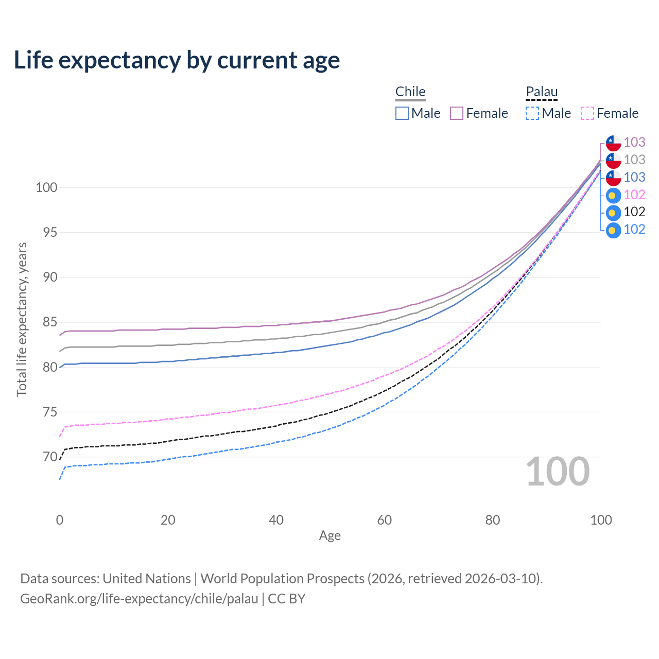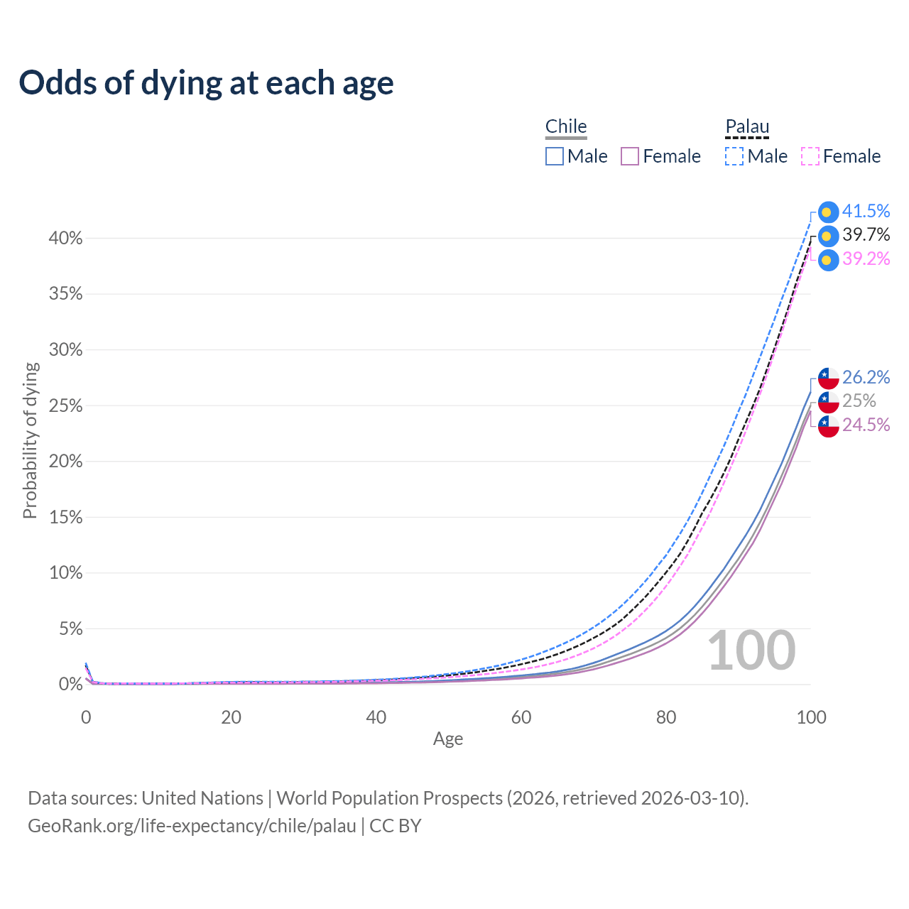 This life expectancy calculator shows the odds of living to 100, 95, 90, and below based on current age for both males and females in Chile and Palau, along with mean and median age of death. The calculations are based on the 2026 life tables (actuarial tables) from the UN World Population Prospects.