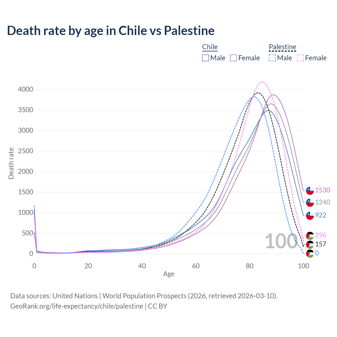 In Chile, the most common age of death is 88, compared to 83 in Palestine. The median age of death is 84.8 in Chile and 80.5 in Palestine, meaning only half of each cohort is expected to live past that age.