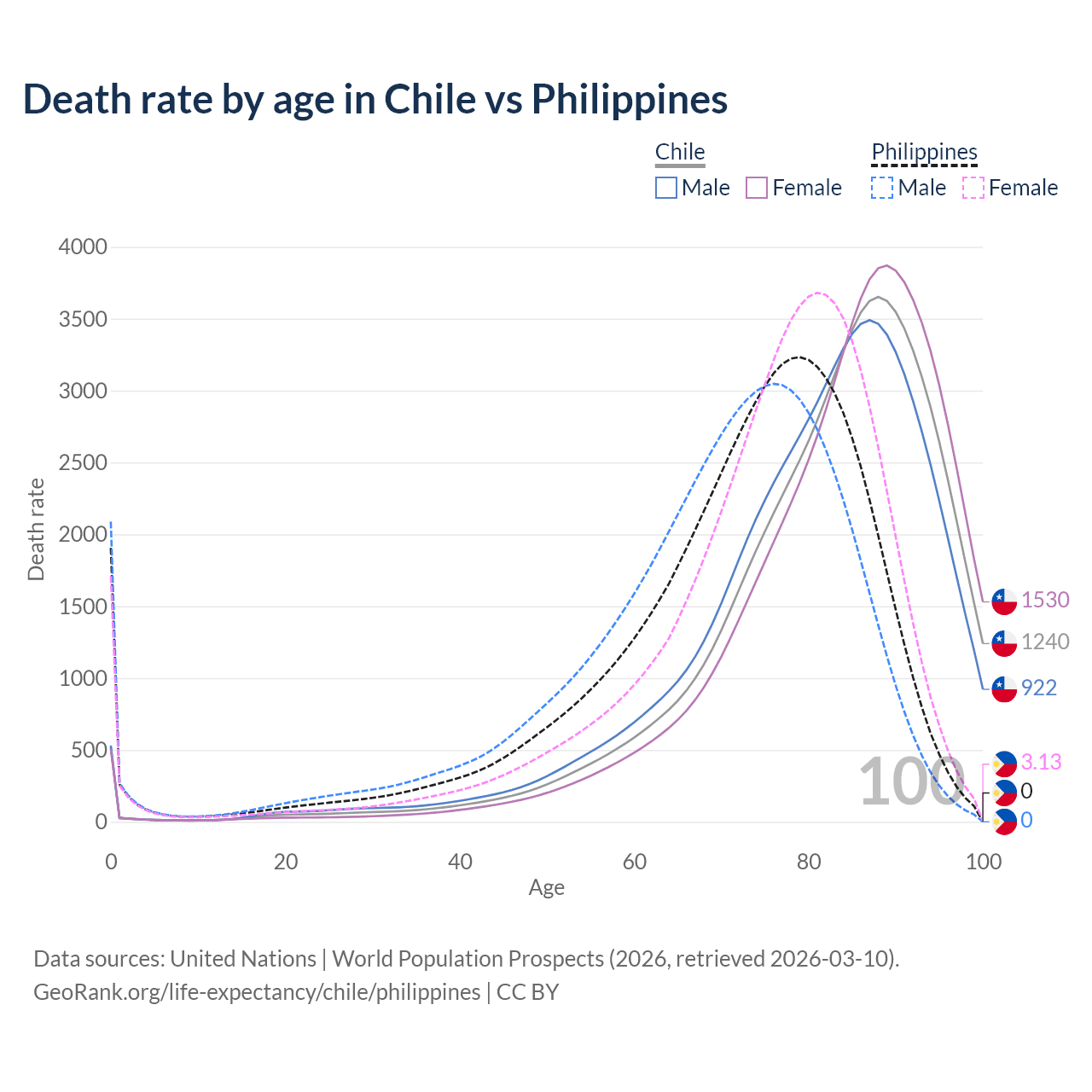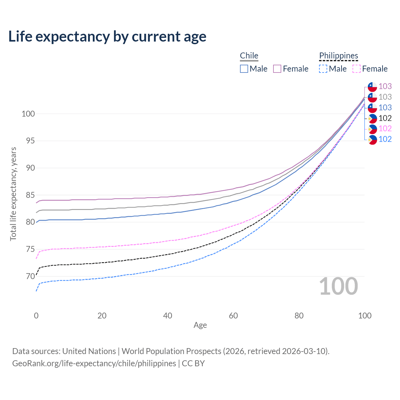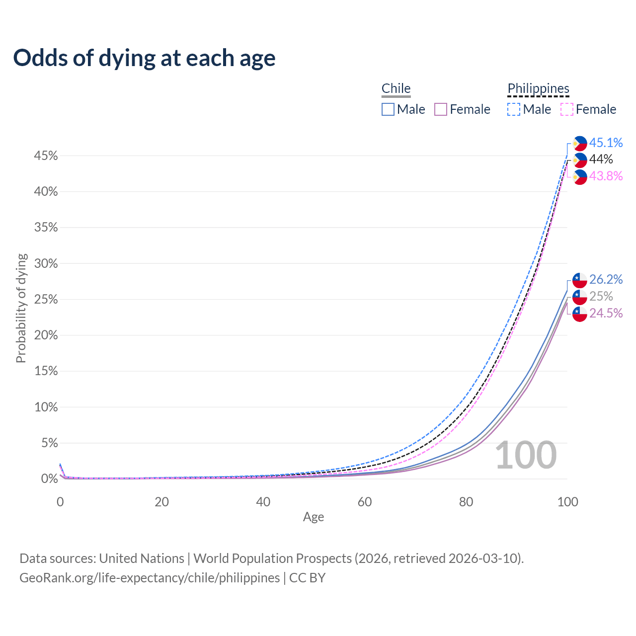 This life expectancy calculator shows the odds of living to 100, 95, 90, and below based on current age for both males and females in Chile and the Philippines, along with mean and median age of death. The calculations are based on the 2026 life tables (actuarial tables) from the UN World Population Prospects.
