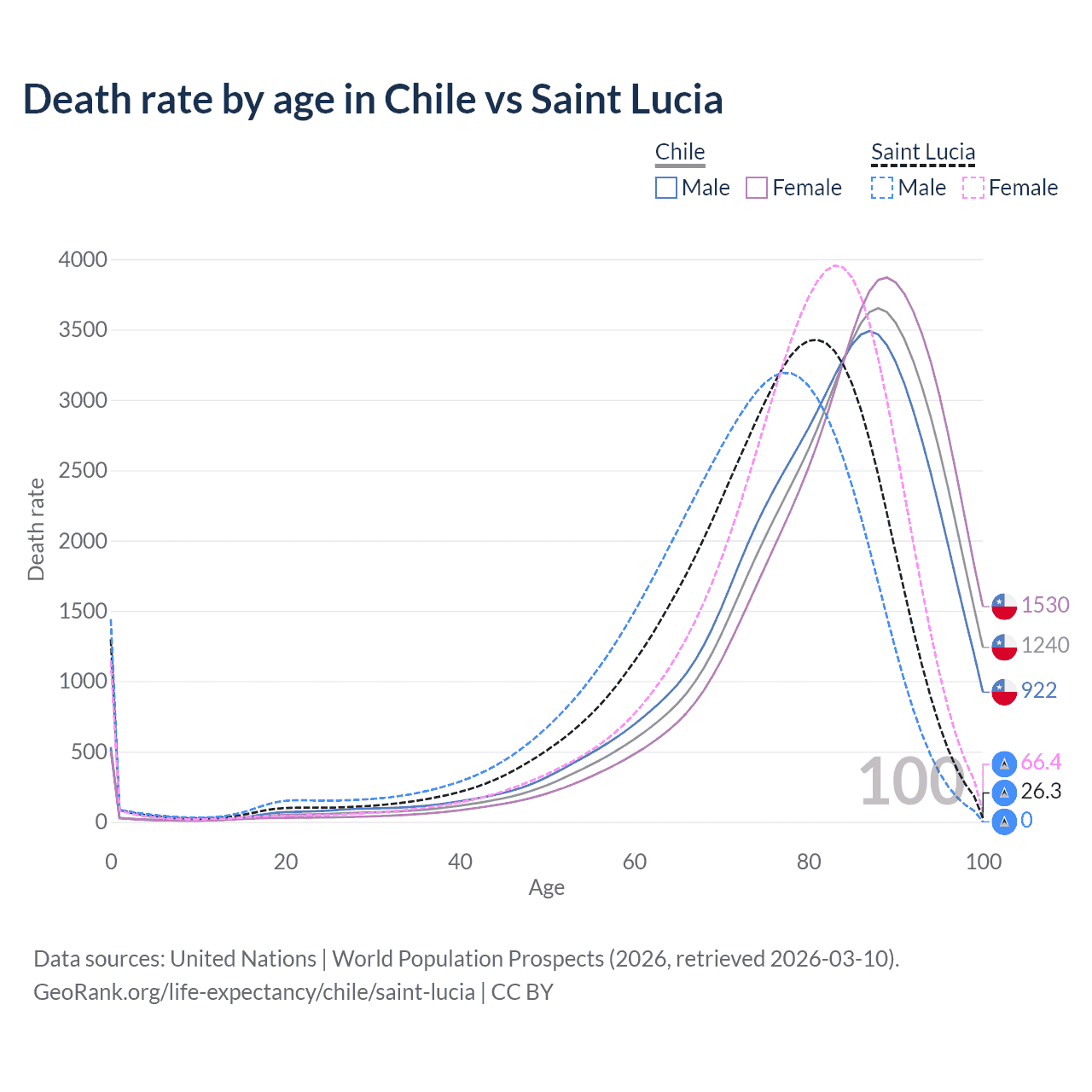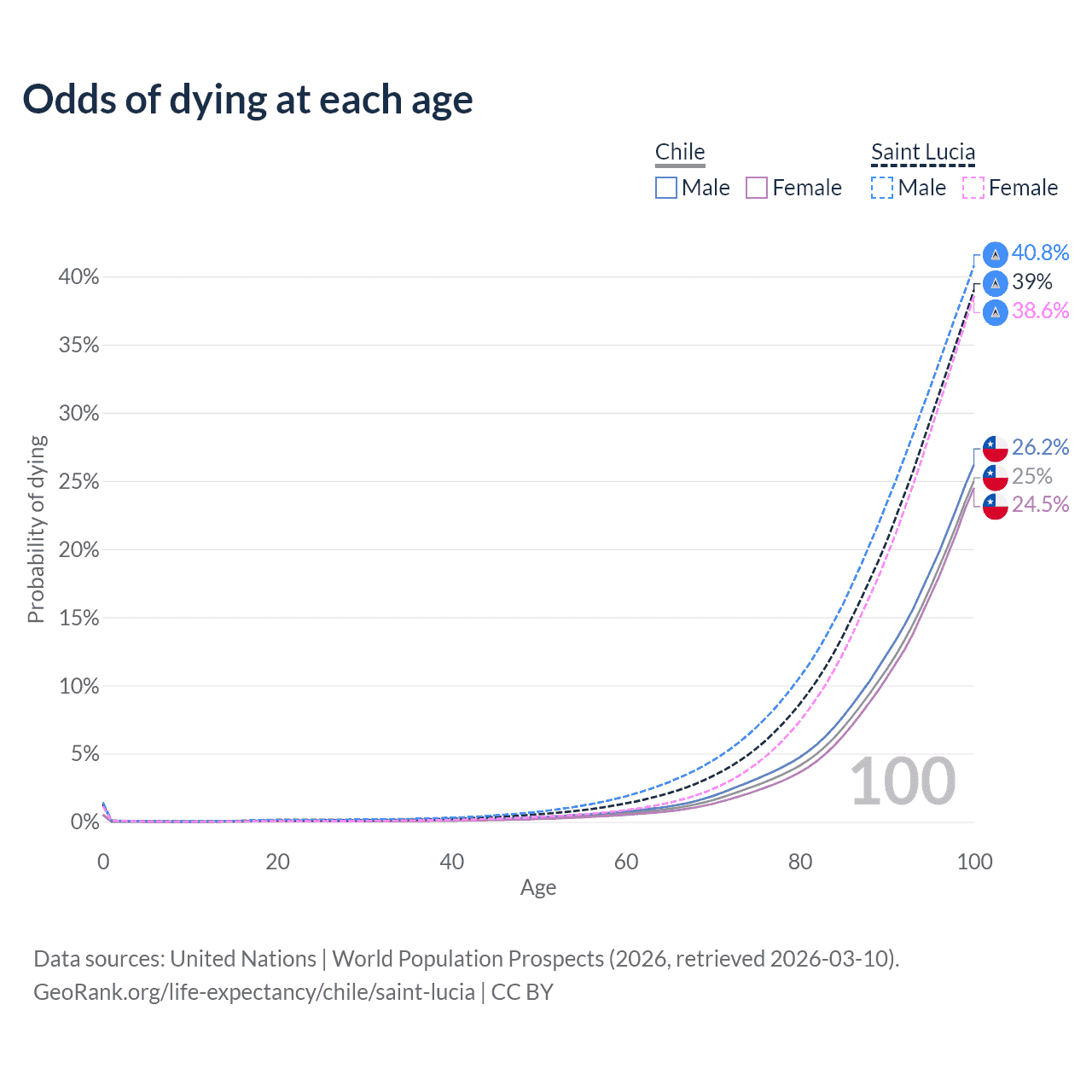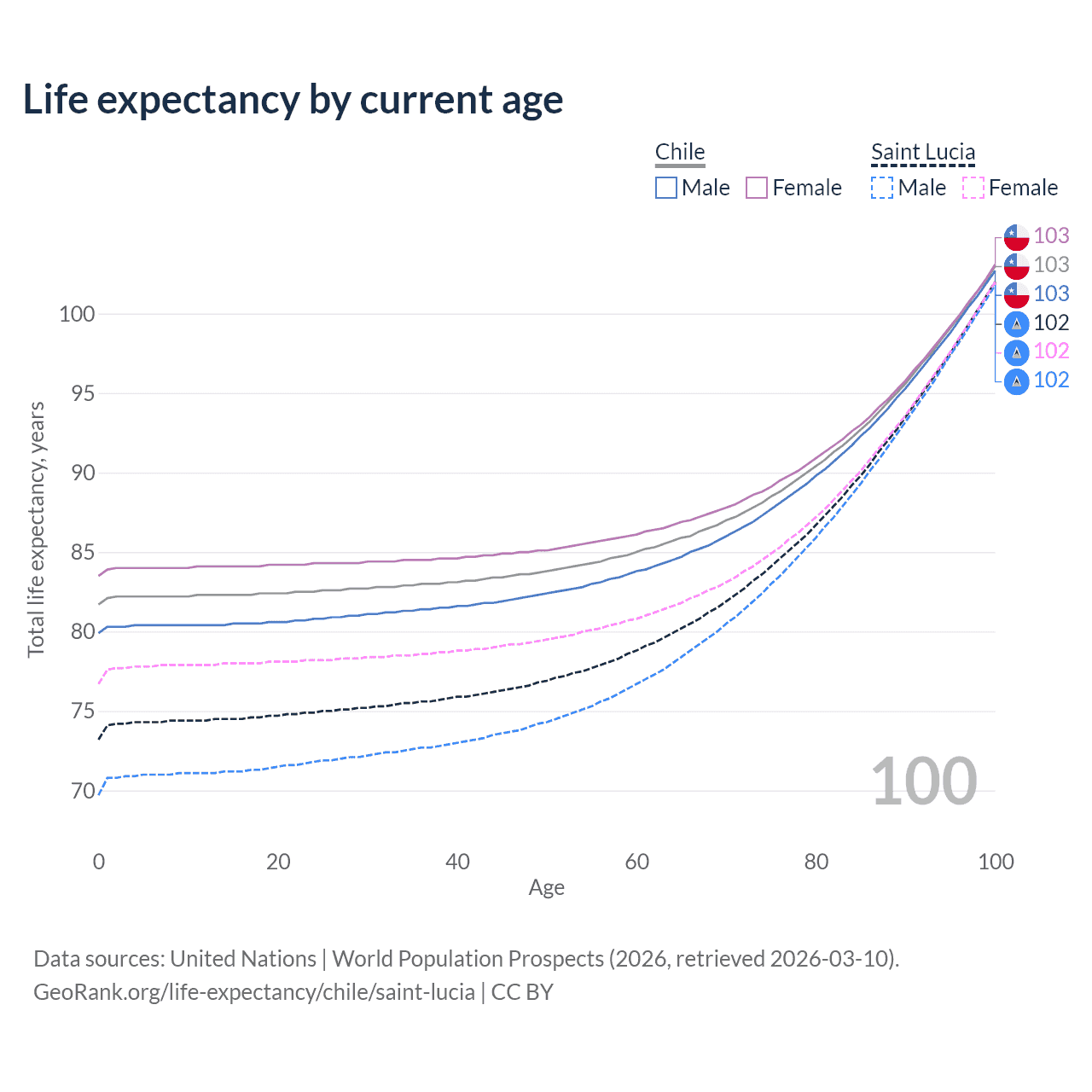 This life expectancy calculator shows the odds of living to 100, 95, 90, and below based on current age for both males and females in Chile and Saint Lucia, along with mean and median age of death. The calculations are based on the 2026 life tables (actuarial tables) from the UN World Population Prospects.