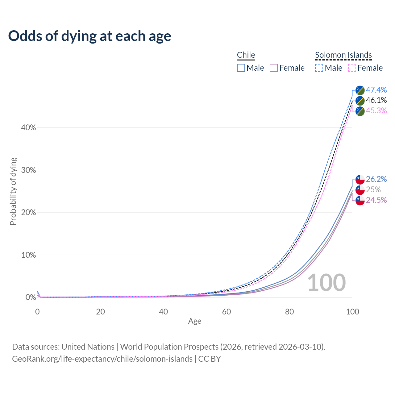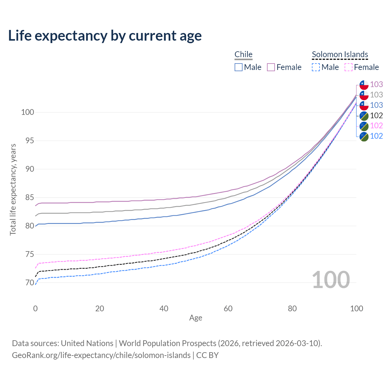 This life expectancy calculator shows the odds of living to 100, 95, 90, and below based on current age for both males and females in Chile and the Solomon Islands, along with mean and median age of death. The calculations are based on the 2026 life tables (actuarial tables) from the UN World Population Prospects.