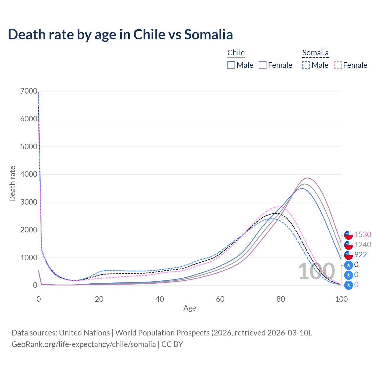 In Chile, the most common age of death is 88, compared to 0 in Somalia. The median age of death is 84.8 in Chile and 69 in Somalia, meaning only half of each cohort is expected to live past that age.