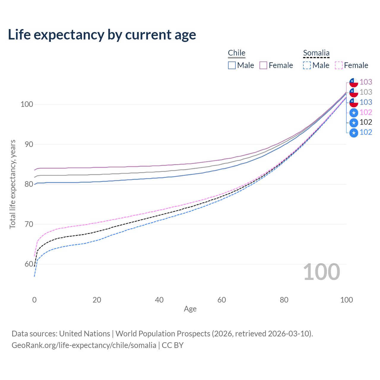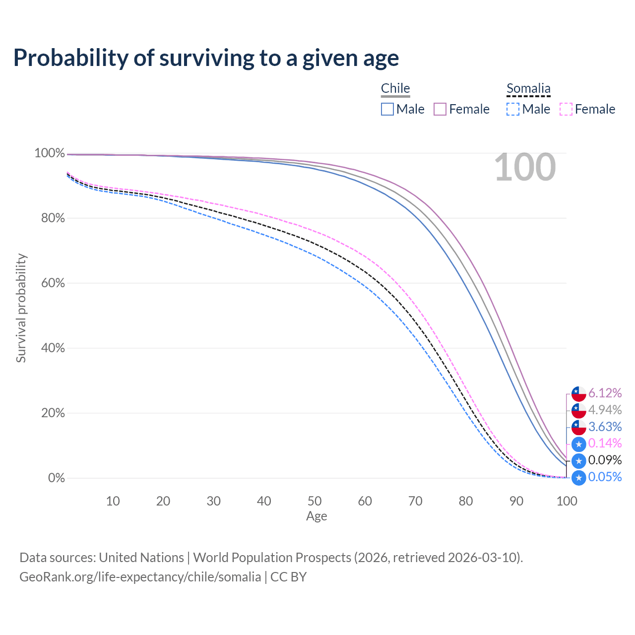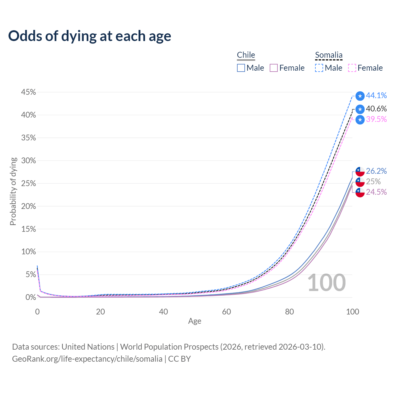 This life expectancy calculator shows the odds of living to 100, 95, 90, and below based on current age for both males and females in Chile and Somalia, along with mean and median age of death. The calculations are based on the 2026 life tables (actuarial tables) from the UN World Population Prospects.