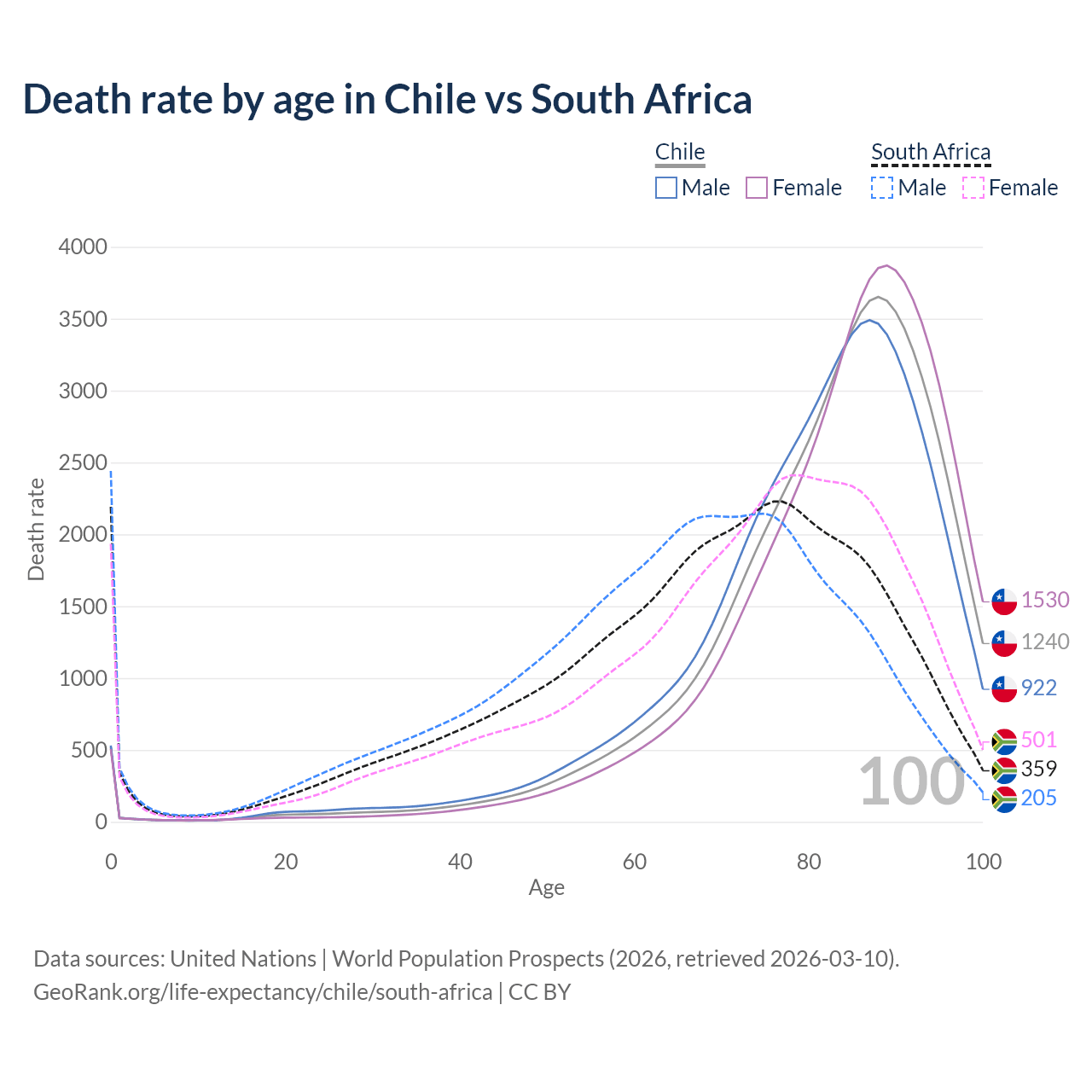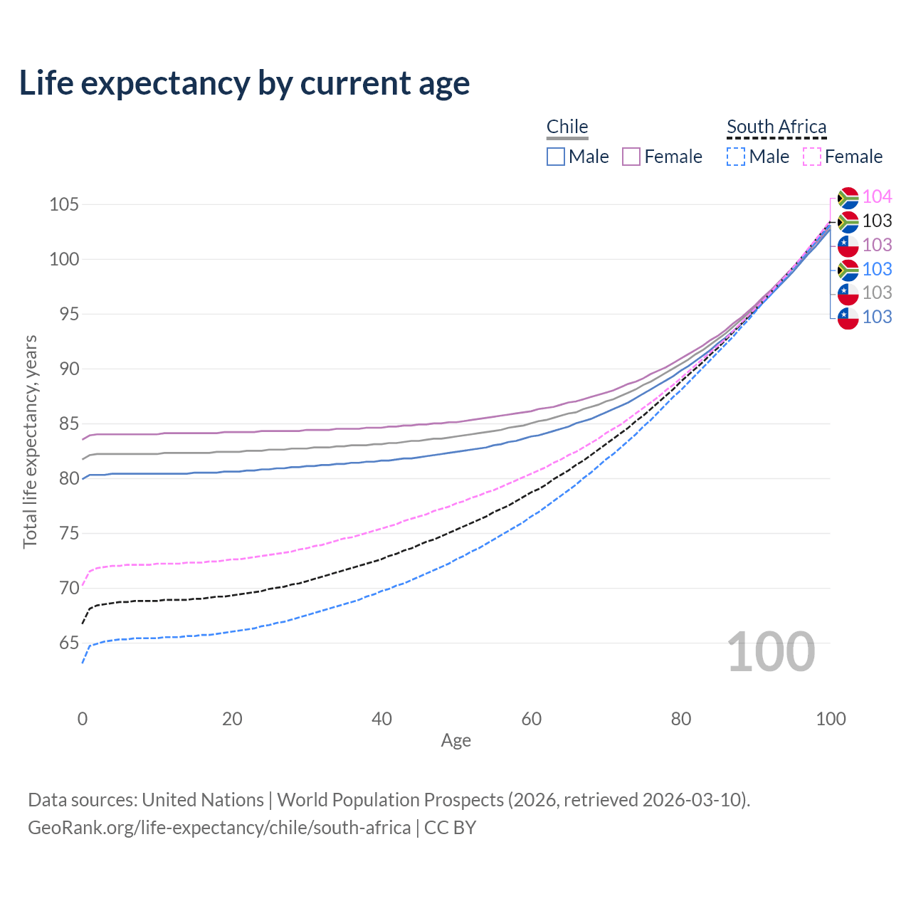 This life expectancy calculator shows the odds of living to 100, 95, 90, and below based on current age for both males and females in Chile and South Africa, along with mean and median age of death. The calculations are based on the 2026 life tables (actuarial tables) from the UN World Population Prospects.