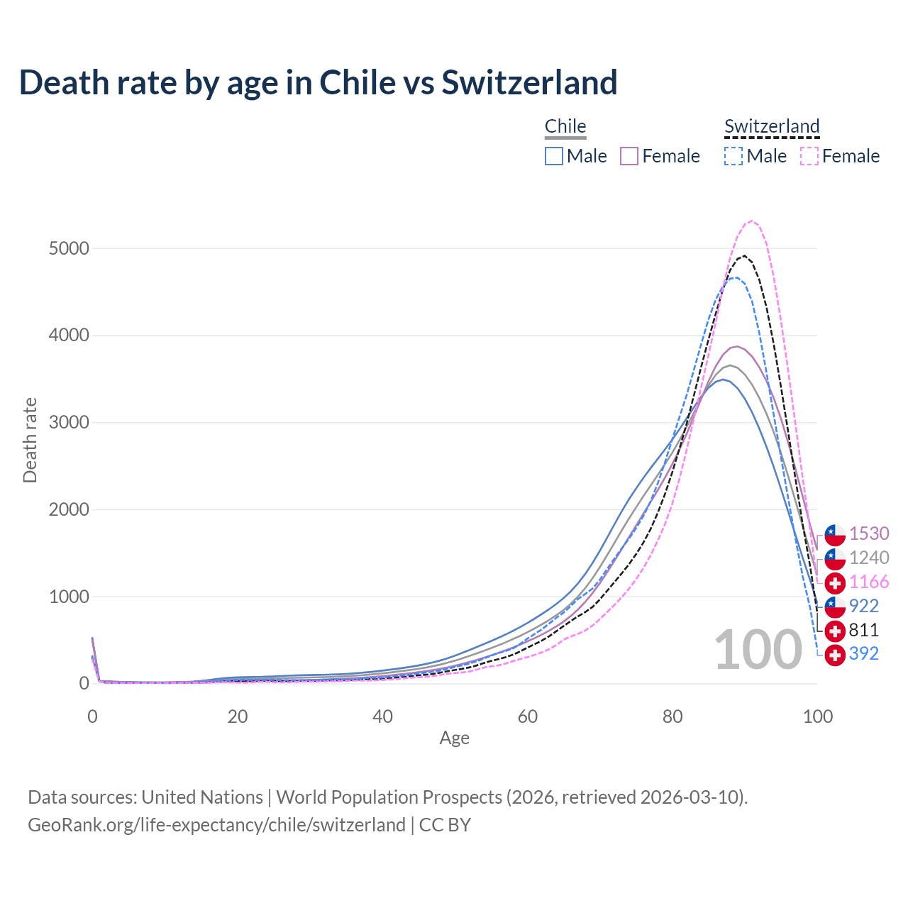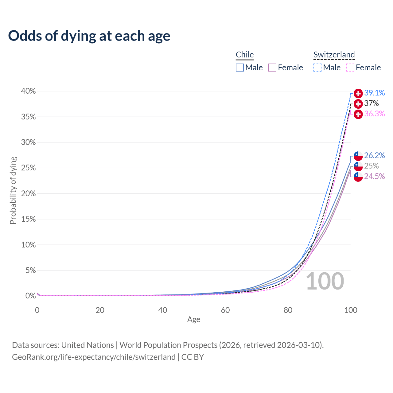 This life expectancy calculator shows the odds of living to 100, 95, 90, and below based on current age for both males and females in Chile and Switzerland, along with mean and median age of death. The calculations are based on the 2026 life tables (actuarial tables) from the UN World Population Prospects.