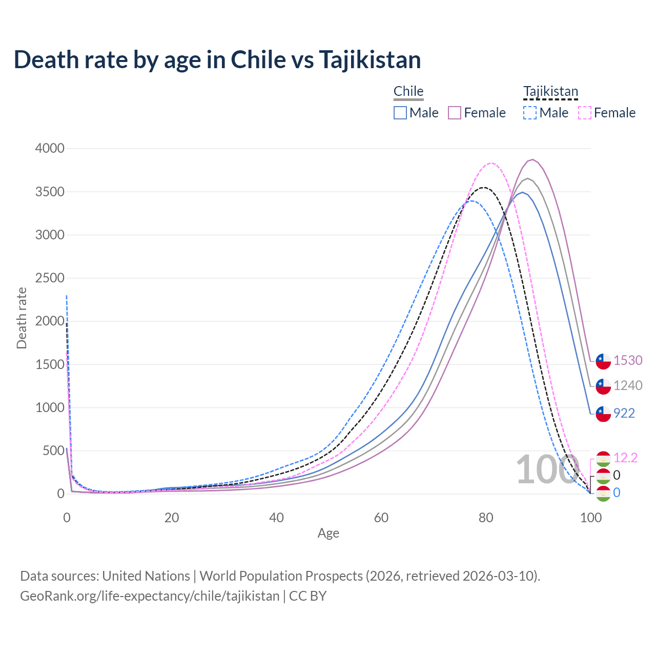 In Chile, the most common age of death is 88, compared to 80 in Tajikistan. The median age of death is 84.8 in Chile and 76 in Tajikistan, meaning only half of each cohort is expected to live past that age.