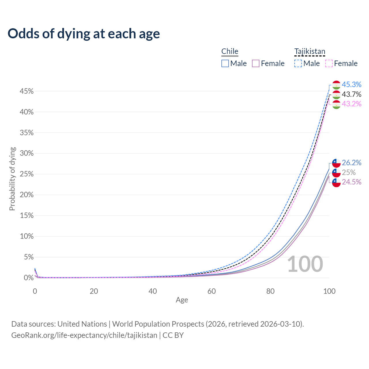 This life expectancy calculator shows the odds of living to 100, 95, 90, and below based on current age for both males and females in Chile and Tajikistan, along with mean and median age of death. The calculations are based on the 2026 life tables (actuarial tables) from the UN World Population Prospects.