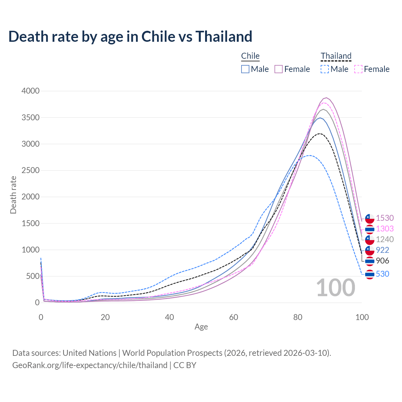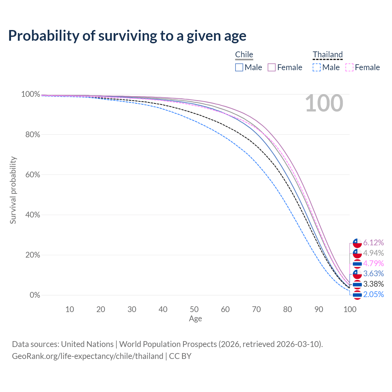 This life expectancy calculator shows the odds of living to 100, 95, 90, and below based on current age for both males and females in Chile and Thailand, along with mean and median age of death. The calculations are based on the 2026 life tables (actuarial tables) from the UN World Population Prospects.