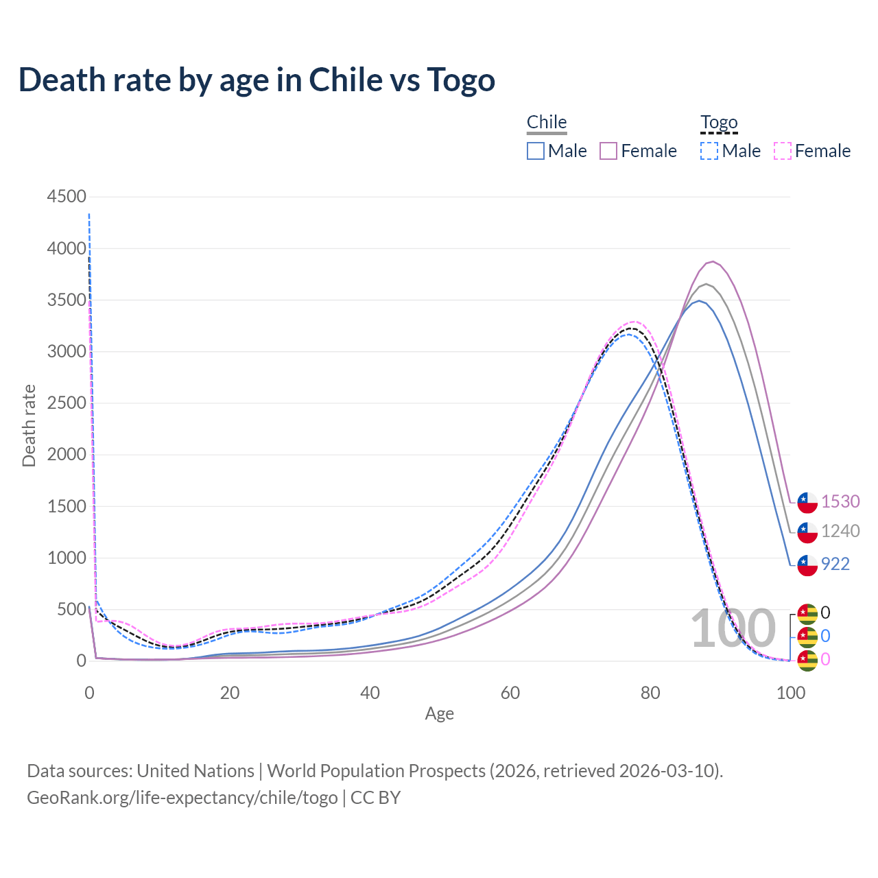 In Chile, the most common age of death is 88, compared to 0 in Togo. The median age of death is 84.8 in Chile and 71 in Togo, meaning only half of each cohort is expected to live past that age.
